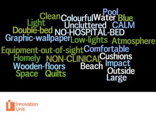 This document provides strategies for changing birth environments to improve staff and user engagement. It recommends visible leadership, involving staff in the design process, and providing training to build confidence with new equipment. It advises making changes now rather than waiting for a new building. Specifically, it suggests removing unnecessary items to create space, investing in low-cost improvements like wallpaper, and challenging labels of "high risk" environments by focusing on safety and comfort.