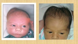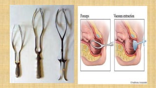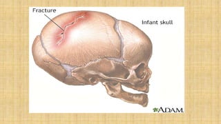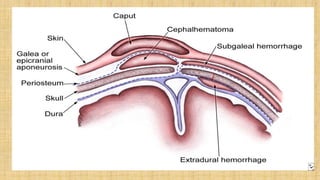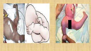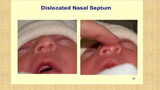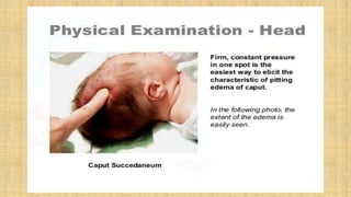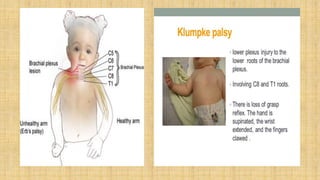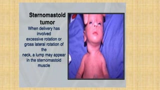 It also covers facial injuries, visceral injuries, fractures, and dislocations that can occur during birth along with their causes, presentations, and treatments. Risk factors for birth injuries include large baby size, instrumental delivery, and abnormal fetal positioning.