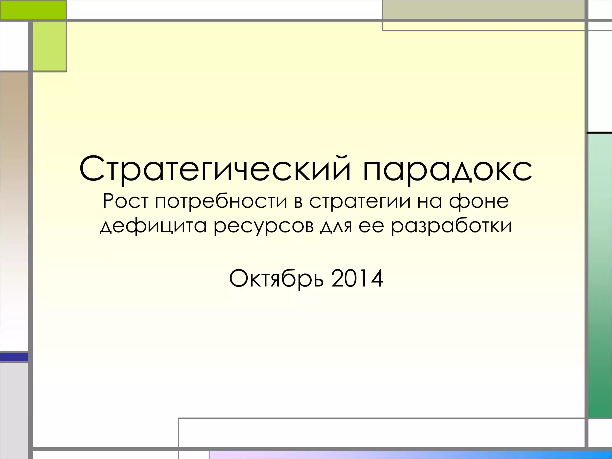 Документ обсуждает стратегический парадокс, подчеркивая рост потребности в стратегии в условиях ограниченных ресурсов для ее разработки. Автор указывает на важность наличия четкой стратегии для выживания компаний в кризисные времена, когда время и ресурсы на разработку стратегии наиболее ограничены. Без эффективного маркетинга, системы управления и стратегии организации рискуют не пережить кризис.