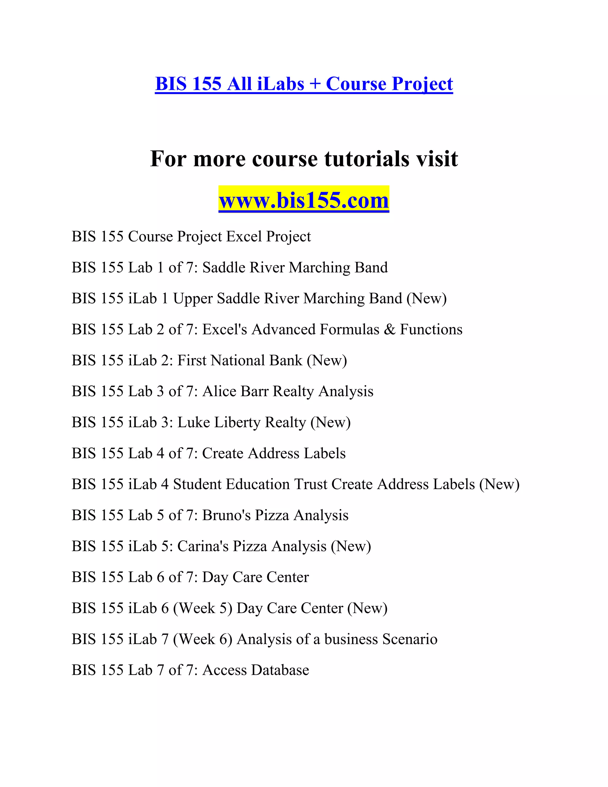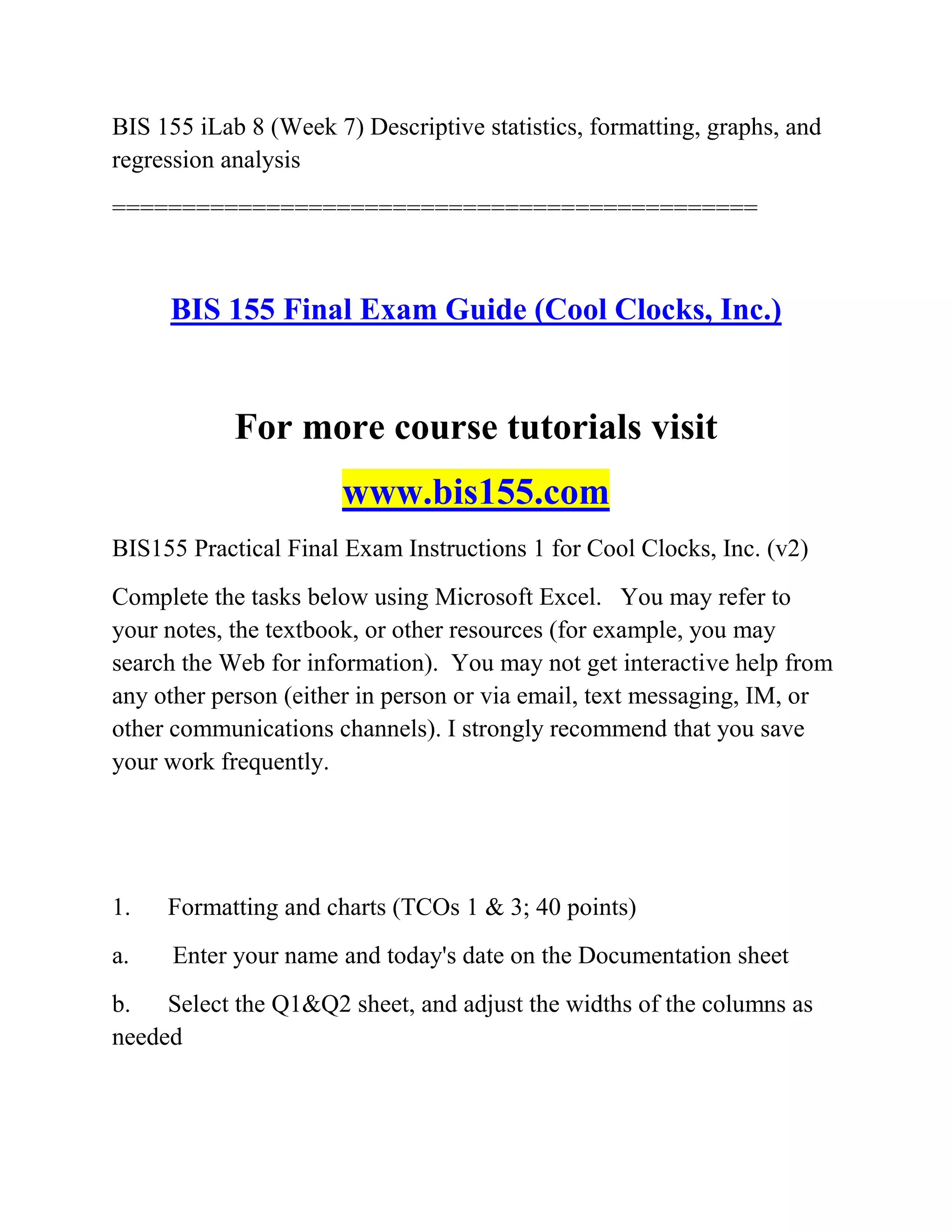 This document provides instructions for completing a final exam in BIS 155 using Microsoft Excel. It includes 5 sections involving various Excel skills: 1) formatting and charts, 2) formulas and applications, 3) data cleansing/lists/sorting/conditional formatting and pivot tables, 4) data consolidation/analysis/reporting, and 5) what-if analysis. The exam uses sample sales data for a company called Cool Clocks, Inc. or Music on Demand to complete tasks testing skills in areas like formatting, formulas, charts, pivot tables, conditional formatting, data analysis, and what-if scenarios. The instructions provide detailed steps to complete tasks in each section for scoring on learning outcomes.