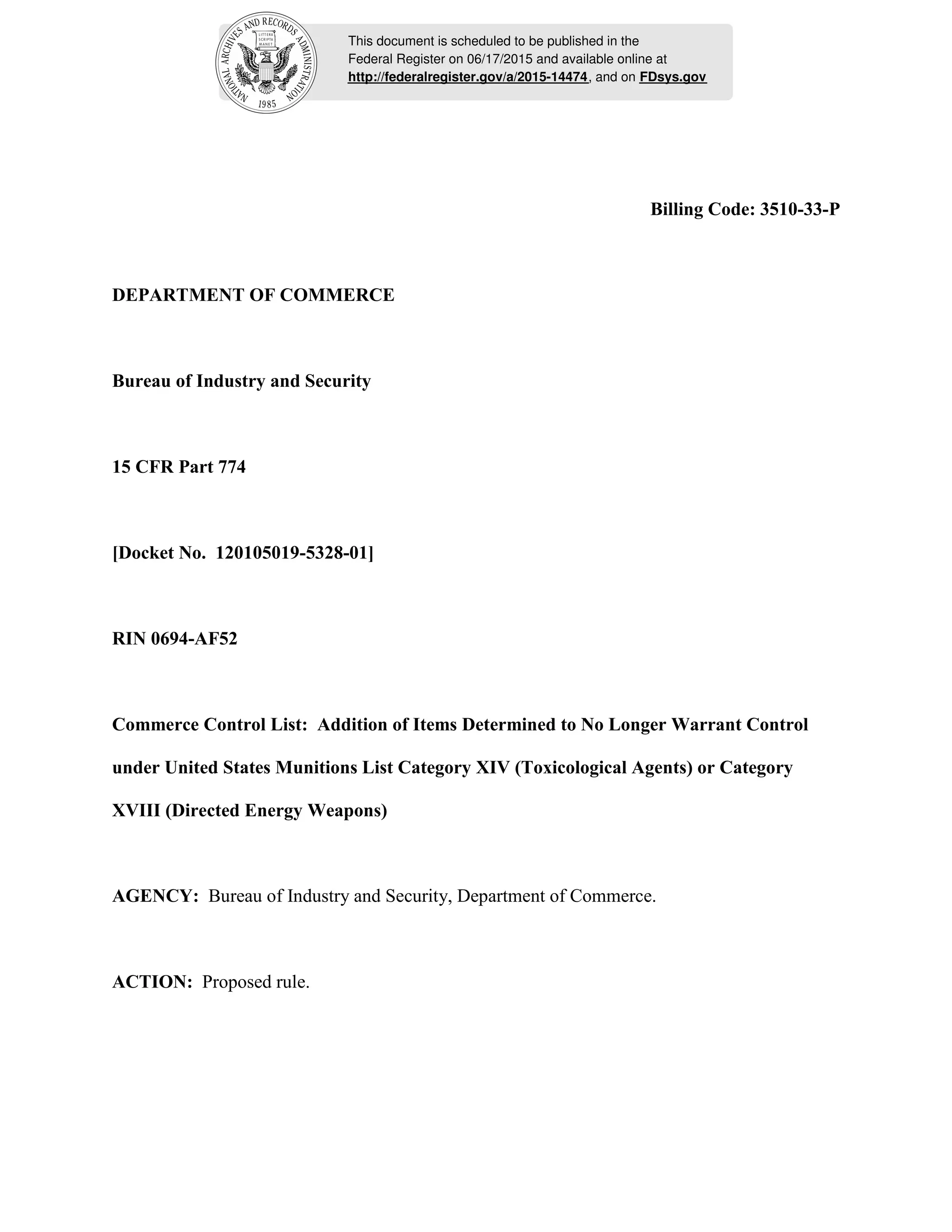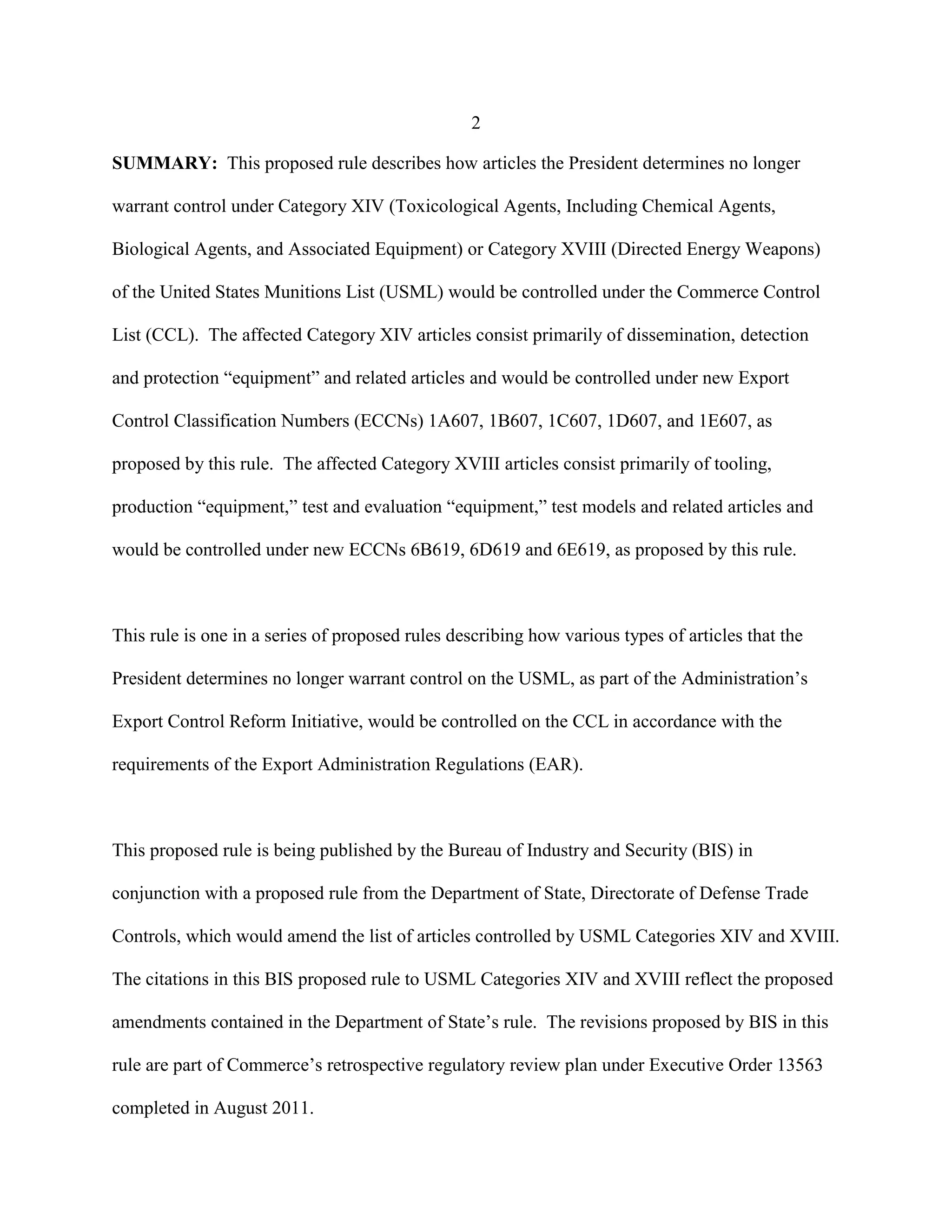 This document proposes rules to transfer certain items from the US Munitions List (USML) to the Commerce Control List (CCL). Specifically, it proposes to transfer certain dissemination, detection and protection equipment from USML Category XIV to new Export Control Classification Numbers (ECCNs) 1A607, 1B607, 1C607, 1D607, and 1E607 under the CCL. It also proposes to transfer certain tooling, production equipment, test and evaluation equipment, and test models from USML Category XVIII to new ECCNs 6B619, 6D619 and 6E619 under the CCL. The document provides background on export control reform and describes the specific items and controls that would