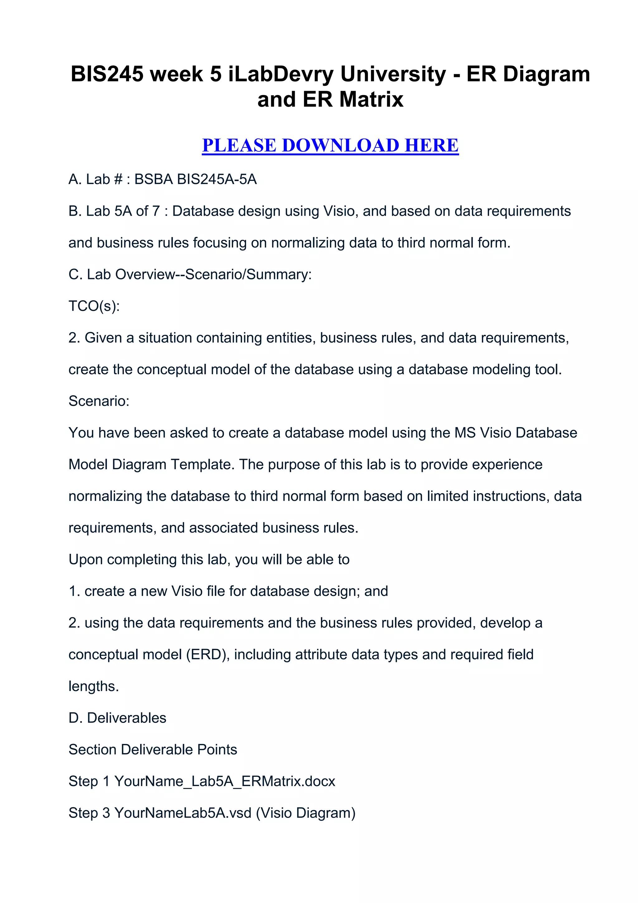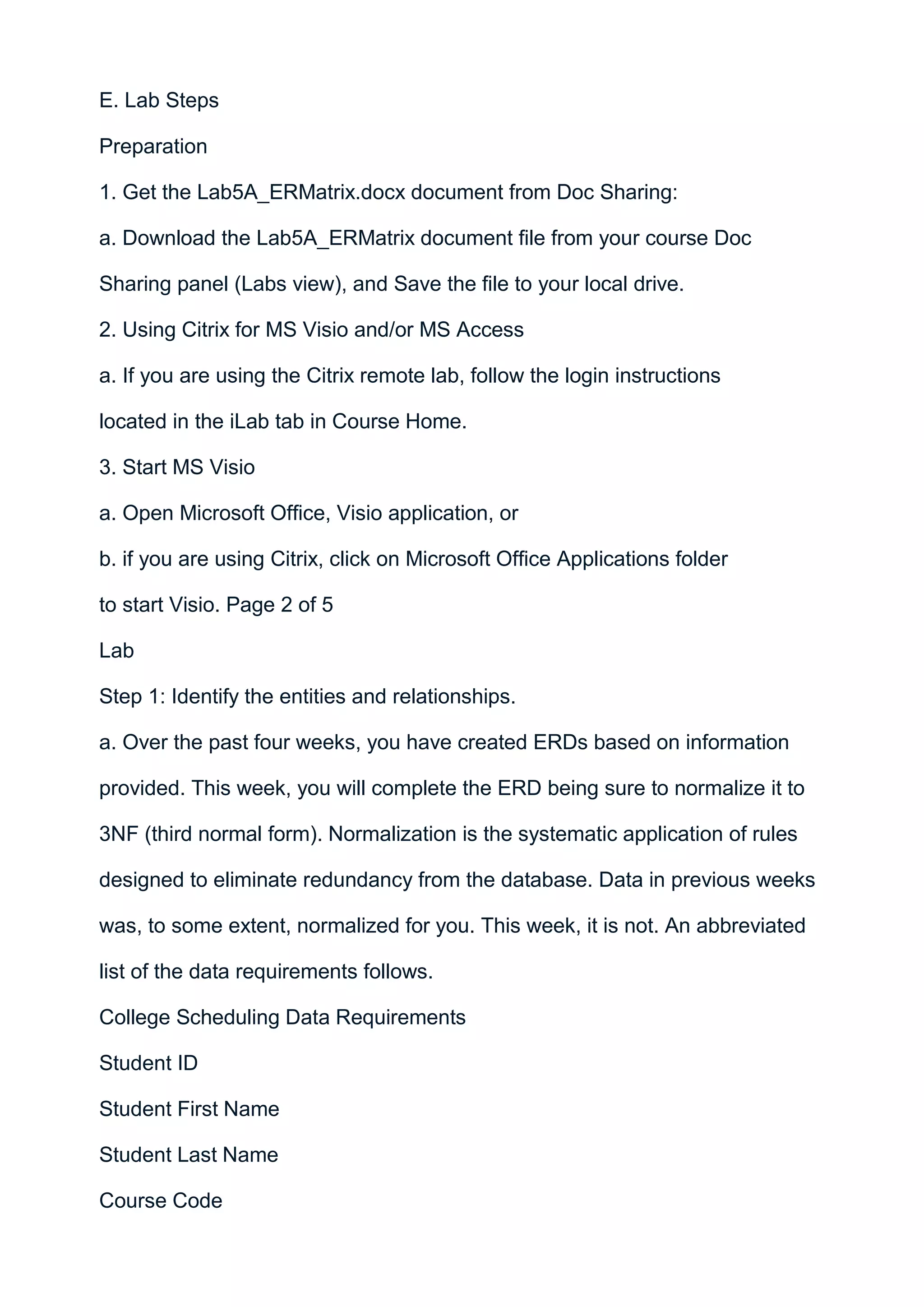 1. The document describes a database design lab that involves normalizing an entity relationship diagram (ERD) to third normal form based on data requirements and business rules for a college scheduling system.
