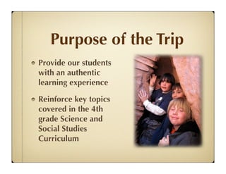 This document provides information about an upcoming 4th grade field trip to Kartchner Caverns and the Bisbee Queen Mine. The trip will take place over two days in late April and will include guided tours of the caverns and mine. The cost is $95 per student and $105 per chaperone. Parents must sign behavior and payment contracts by February 10th for students to be eligible. The document outlines the daily itinerary, payment options, chaperone roles, and answers frequently asked questions.