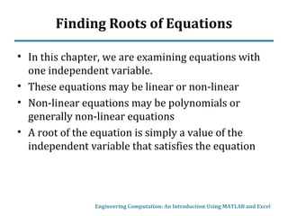 This document describes the bisection method for finding roots of equations numerically. It begins by classifying equations as linear, polynomial, or generally non-linear. For non-linear equations, numerical methods are required. The bisection method iteratively halves the interval that contains a root until a solution is found to within a specified tolerance. An example illustrates the step-by-step process of applying the bisection method to find the root of a sample function. MATLAB code is also presented to implement the bisection method.
