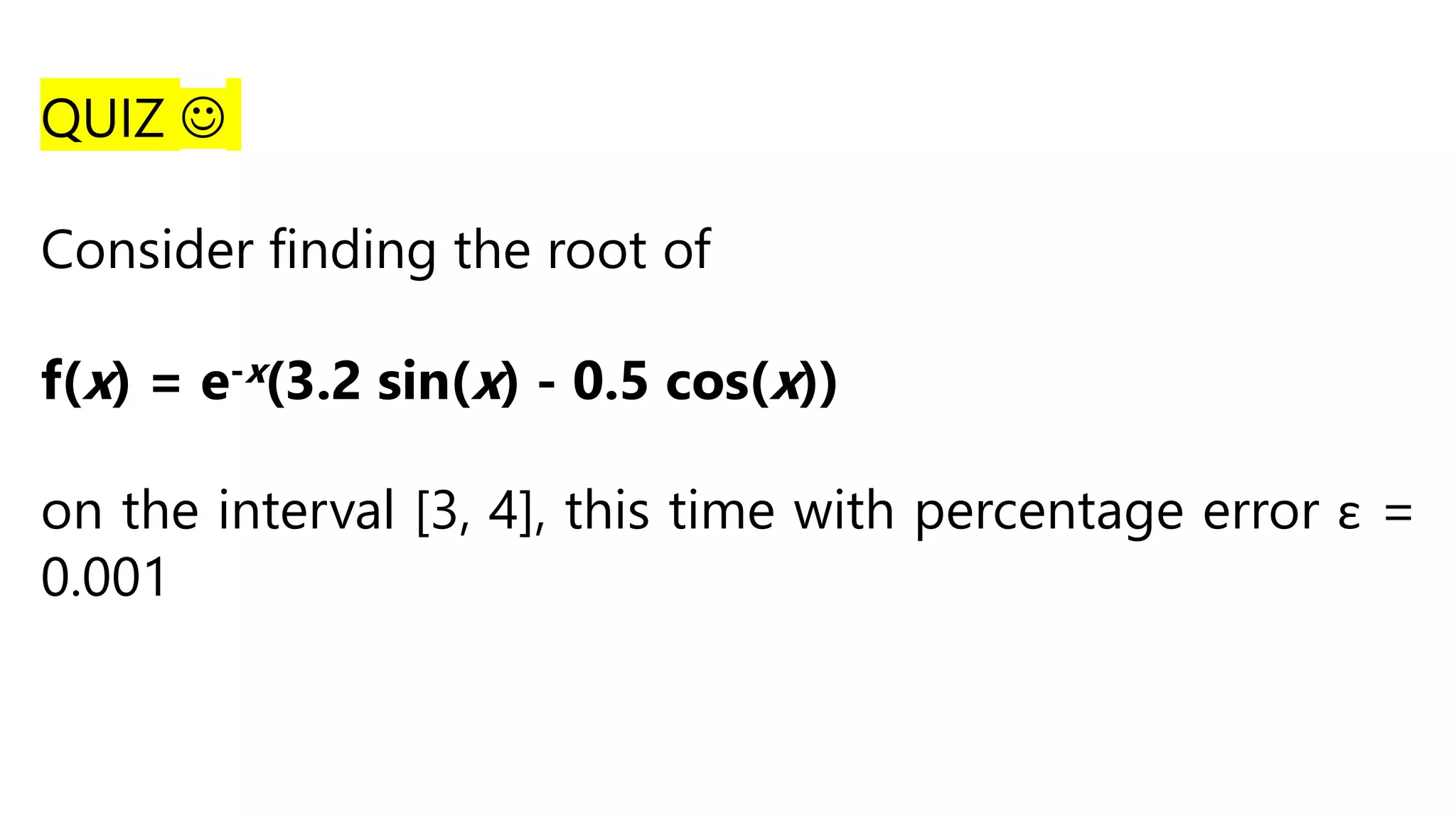 This document discusses finding the root of the function f(x) = e-x(3.2 sin(x) - 0.5 cos(x)) on the interval [3, 4] with a percentage error of 0.001.