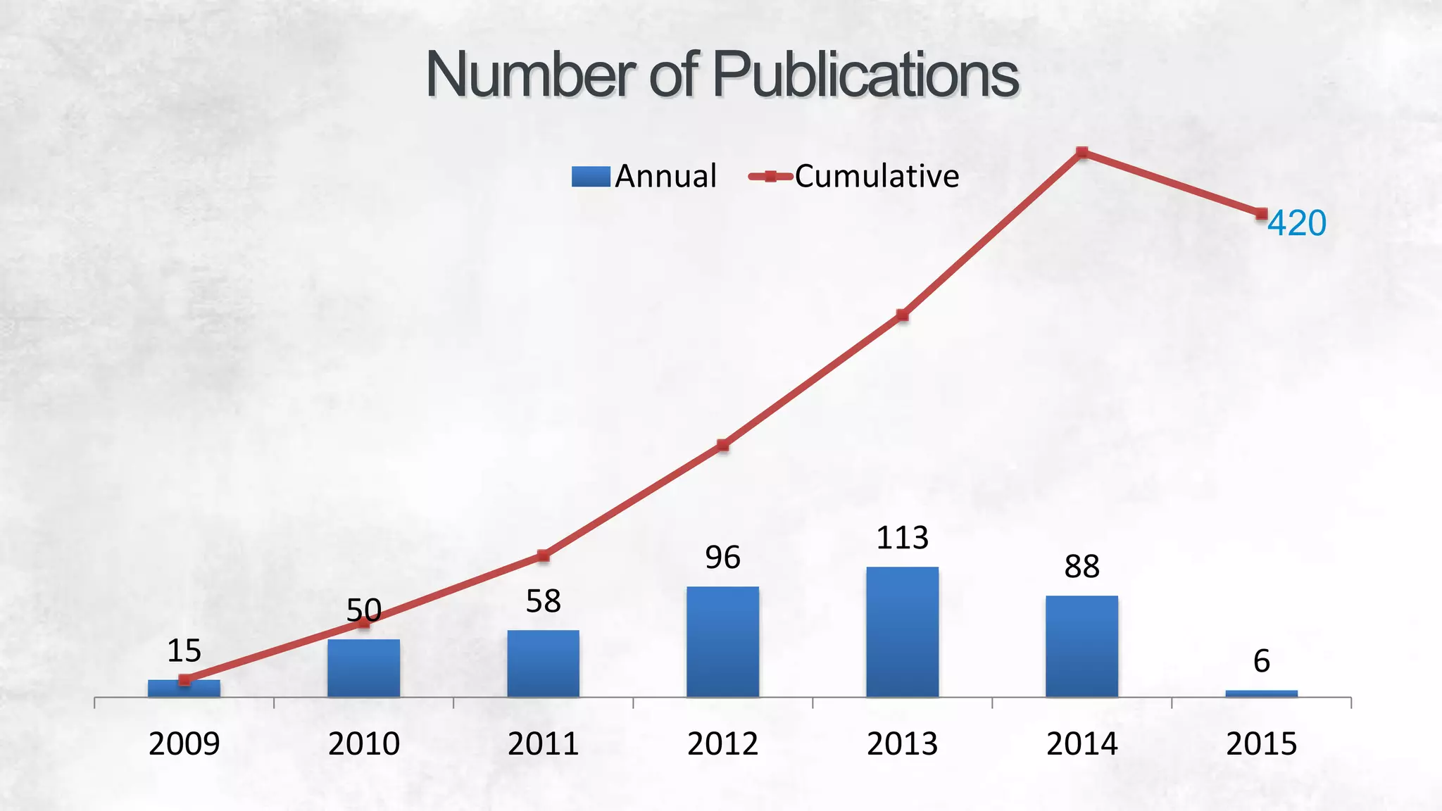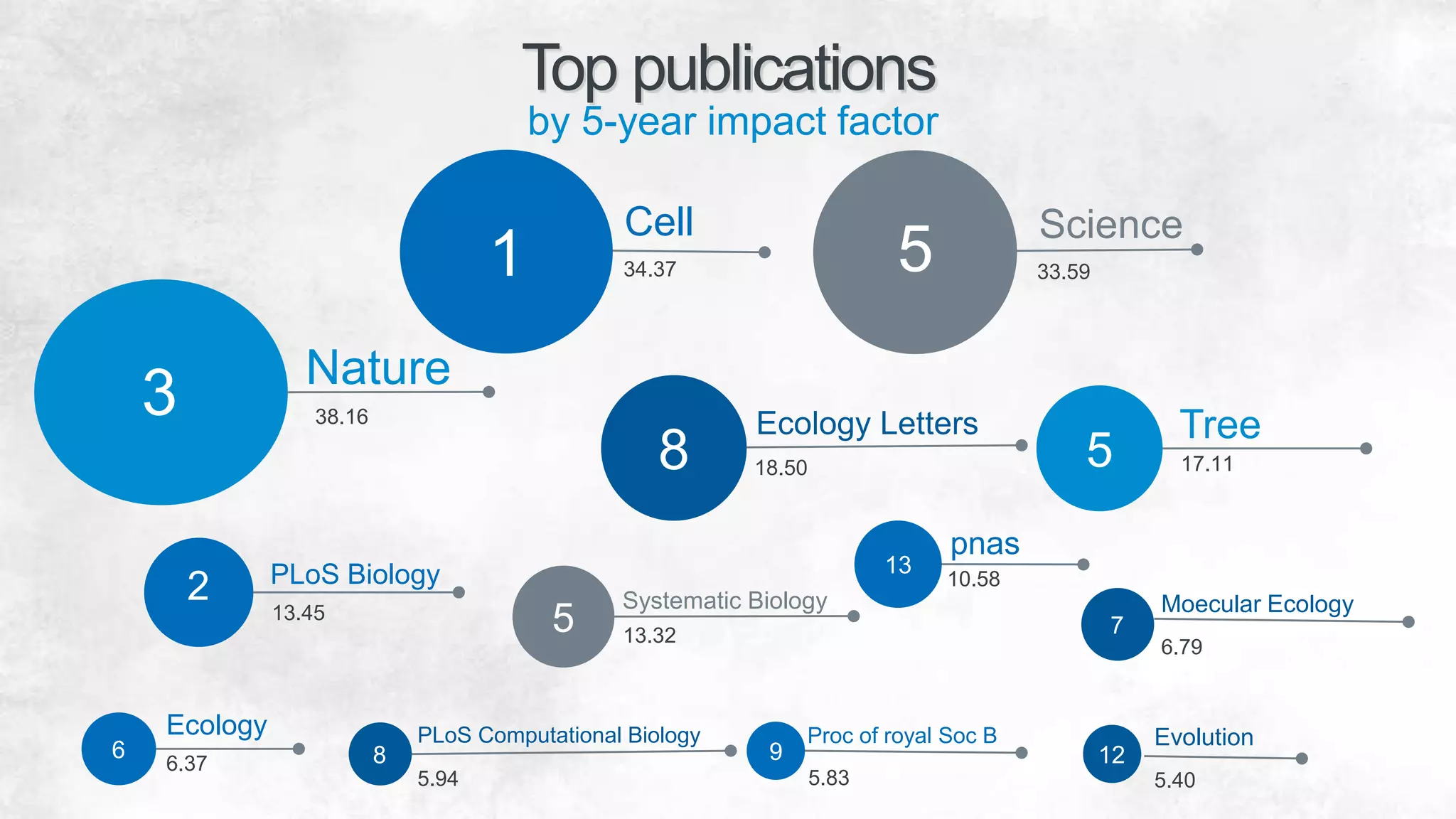 This document provides bibliometric and publication data for NIMBioS (National Institute for Mathematical and Biological Synthesis). It shows that the number of annual publications has increased each year from 2009 to 2015. It also lists the top publications by 5-year impact factor and identifies the sources of NIMBioS research products. Charts show international collaboration between 43 countries and increases in co-authored publications over 5 years. Additional data includes altmetrics, research areas, participant experiences in working groups, and social media presence. Cost analyses are also presented for different NIMBioS programs.