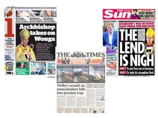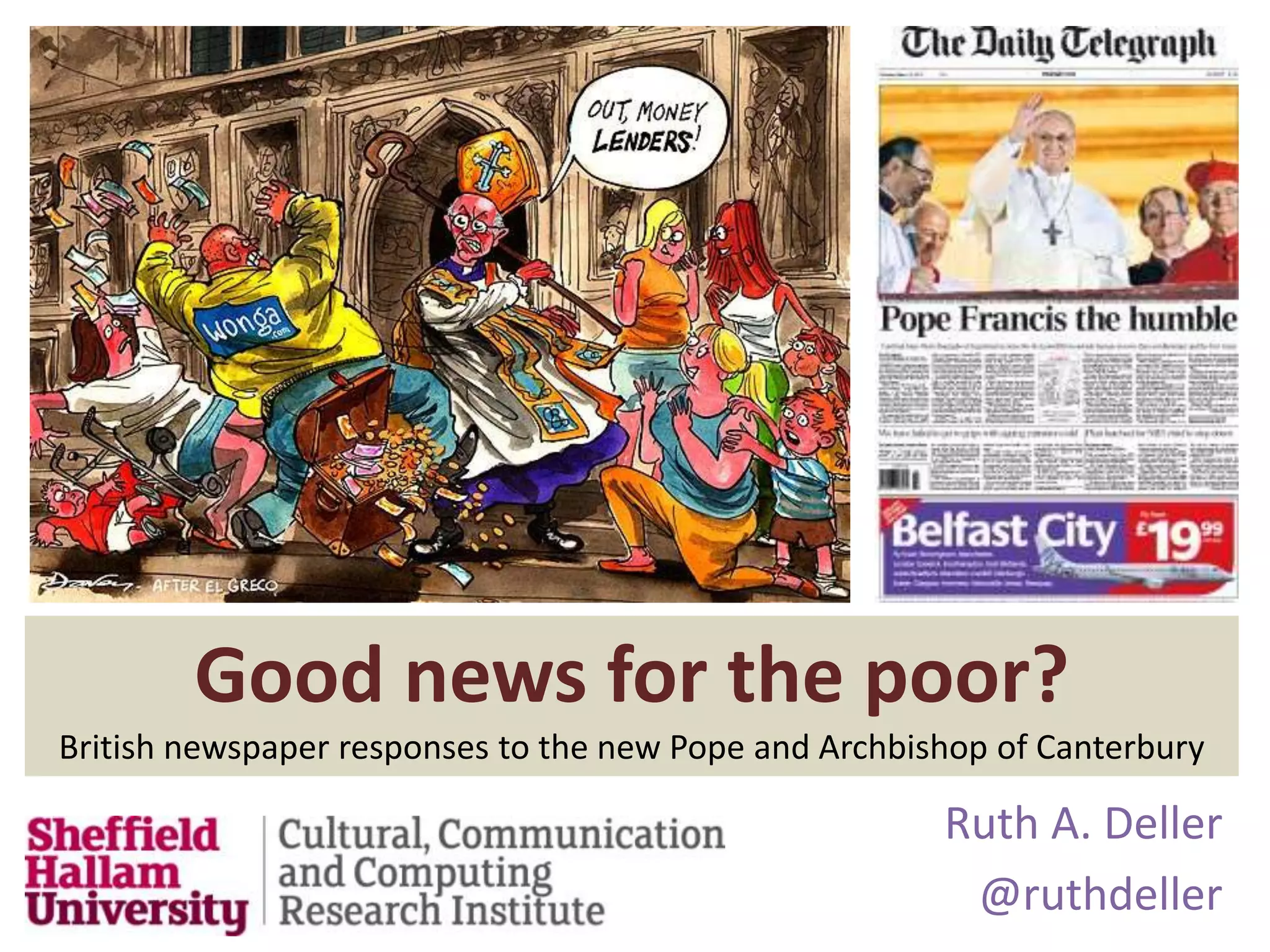 This document summarizes media coverage of Pope Francis and Archbishop of Canterbury Justin Welby on issues related to poverty, women, homosexuality, and child abuse. It finds that both religious leaders receive significant press on their focus on poverty, but conservative views on women and homosexuality also receive coverage. Coverage of Welby's changing views on homosexuality over time is also documented. Criticism of both leaders for not going far enough in advancing social issues like women's rights and gay marriage is also presented.