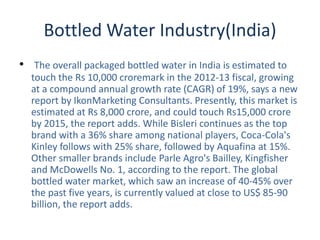 The bottled water industry in India is valued at Rs. 8,000 crore currently and is expected to reach Rs. 15,000 crore by 2015, growing at a CAGR of 19%. Bisleri continues to be the market leader with 36% share while Coca-Cola's Kinley is in second place with 25% share. Bisleri has a 40% market share and distributes through 17 owned plants, 33 co-packers and 11 franchisees across India. Kinley holds around 25% market share and targets health conscious middle and higher income individuals with its emphasis on reverse osmosis purification. Both brands aim to make purified drinking water accessible nationwide.