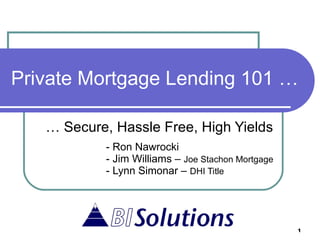The document is an educational seminar presentation on private mortgage lending, outlining the opportunities and benefits for potential private lenders in the current economic landscape. It explains the definition of private lending, the potential returns compared to traditional banking, and emphasizes the importance of borrower evaluation and legal aspects. The presentation concludes with encouragement for participants to engage in private lending as a profitable investment strategy.