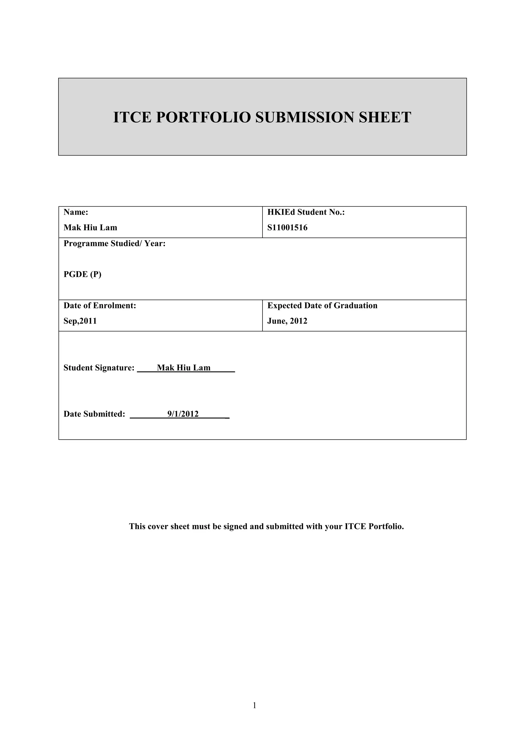 This document is a portfolio submission sheet for a student named Mak Hiu Lam studying in the PGDE(P) programme. It contains two sections - one for items submitted at the Basic ITCE level and one for the Intermediate level.