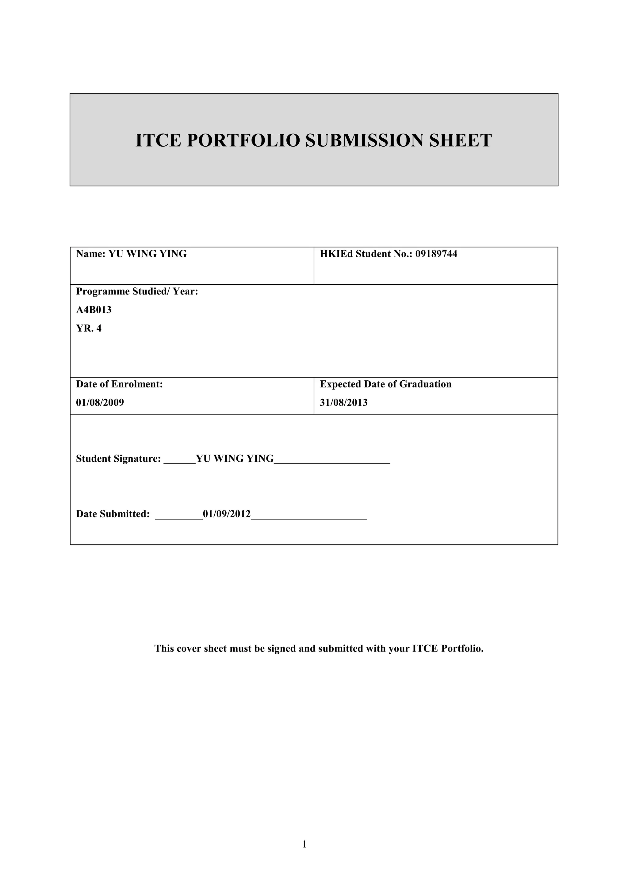 This document is a portfolio submission sheet for a student named Yu Wing Ying. It includes [1] personal information like name, student number, program of study and dates of enrollment and expected graduation. [2] A declaration that the portfolio items submitted are the student's own work. [3] A list of three portfolio items completed at the Basic ITCE level along with a signature declaring their completion. [4] A similar list and declaration for three Intermediate level portfolio items. The student signs and dates the document, submitting it with their ITCE Portfolio.