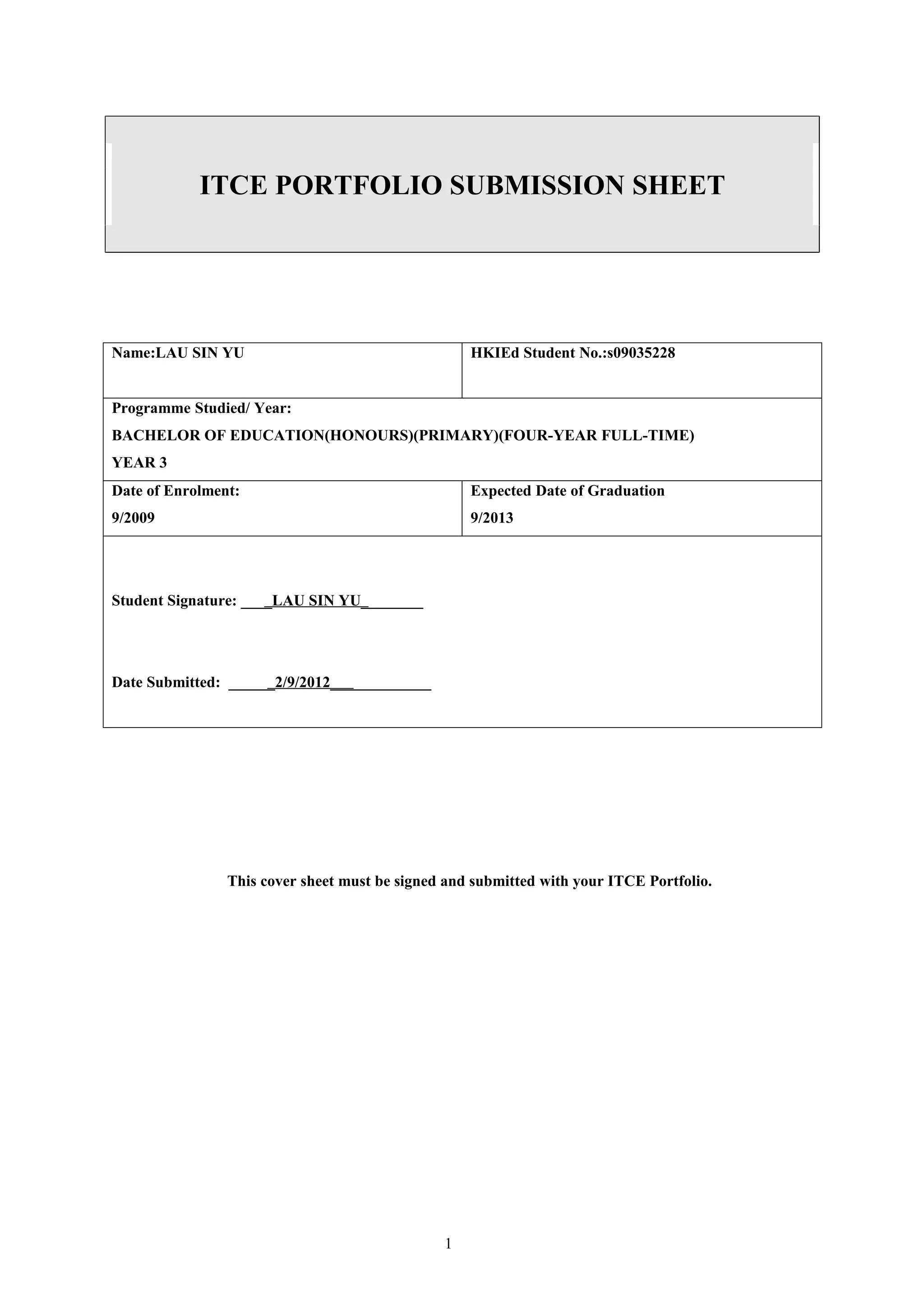 This document is a portfolio submission sheet for a Bachelor of Education student named Lau Sin Yu. It includes a cover sheet with Lau's student information and signature submitting the portfolio. The portfolio contains items demonstrating Lau's basic and intermediate IT competency levels, as required by the ITCE program. At the basic level, Lau includes a lesson plan, reflective statement on using IT in her studies, and short essay on IT in teaching. At the intermediate level, Lau includes a lesson plan using educational software, reflective statement on how ICT helps learning, and self-evaluation of an educational software lesson. Lau signs a declaration that the work is her own and indicates her achieved ITCE level.