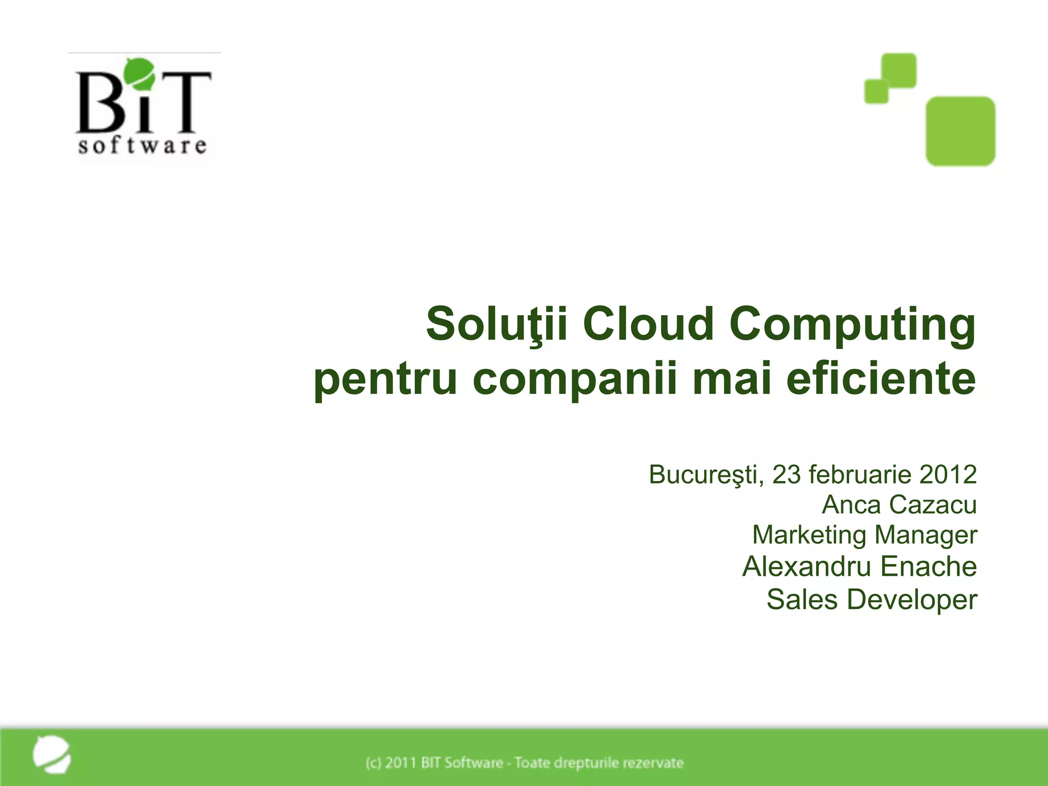 Documentul discută soluțiile de cloud computing pentru companii, evidențiind avantajele utilizării platformei SocrateOpen, care oferă soluții ERP și CRM integrate în cloud. Se menționează beneficiile, cum ar fi costurile reduse, scalabilitatea și suportul tehnic, dar și provocările cu care se confruntă utilizatorii în adoptarea tehnologiilor moderne de colaborare. Google Apps este evidențiat ca un instrument esențial pentru eficientizarea comunicării și colaborării în echipe, facilitând gestionarea informațiilor și planificarea activităților.