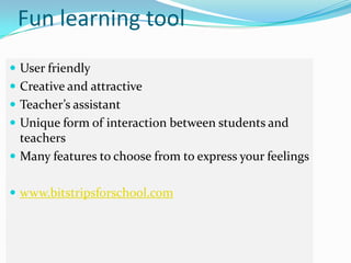 This document discusses an online learning tool called Bitstrips for Schools that allows for creative and attractive student-teacher interaction through many customizable features. It describes the tool as being user friendly and functioning as a teacher's assistant with different options for students to express themselves.