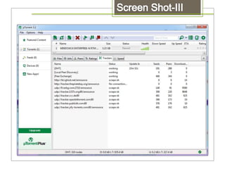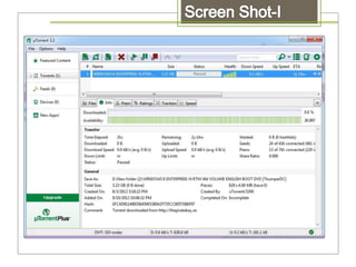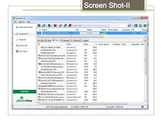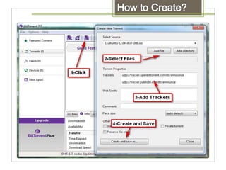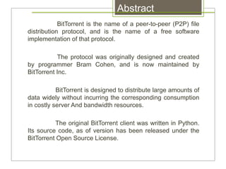 BitTorrent is a peer-to-peer file sharing protocol designed to distribute large files widely without incurring high costs for servers or bandwidth. It works by breaking files into pieces that are shared among users (peers) in the network, where each peer uploads pieces to others while downloading different missing pieces. A metadata file called a torrent file contains information about the pieces to download. Peers connect to each other via a tracker server to establish connections for sharing pieces. Once a peer has all the pieces, it becomes a seed continuing to provide the full file to others.