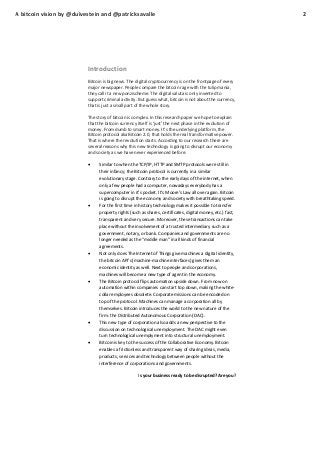 The story of bitcoin is complex. In this research paper we hope to explain that the bitcoin currency itself is ‘just’ the next phase in the evolution of money. From dumb to smart money. It’s the underlying platform, the Bitcoin protocol aka Bitcoin 2.0, that holds the real transformative power. That is where the revolution starts. According to our research there are several reasons why this new technology is going to disrupt our economy and society as we have never experienced before: