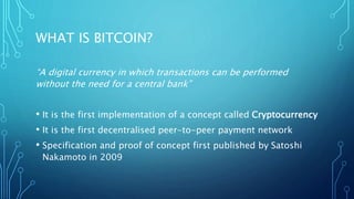 Bitcoin is a decentralized digital currency that allows transactions without a central bank, first introduced by Satoshi Nakamoto in 2009. It operates on a public ledger called the blockchain, which verifies transactions and maintains transparency while users control their own bitcoin addresses. Users can obtain bitcoins by purchasing them or accepting them in exchange for goods and services, and transactions are recorded and verified by miners who add them to the blockchain.
