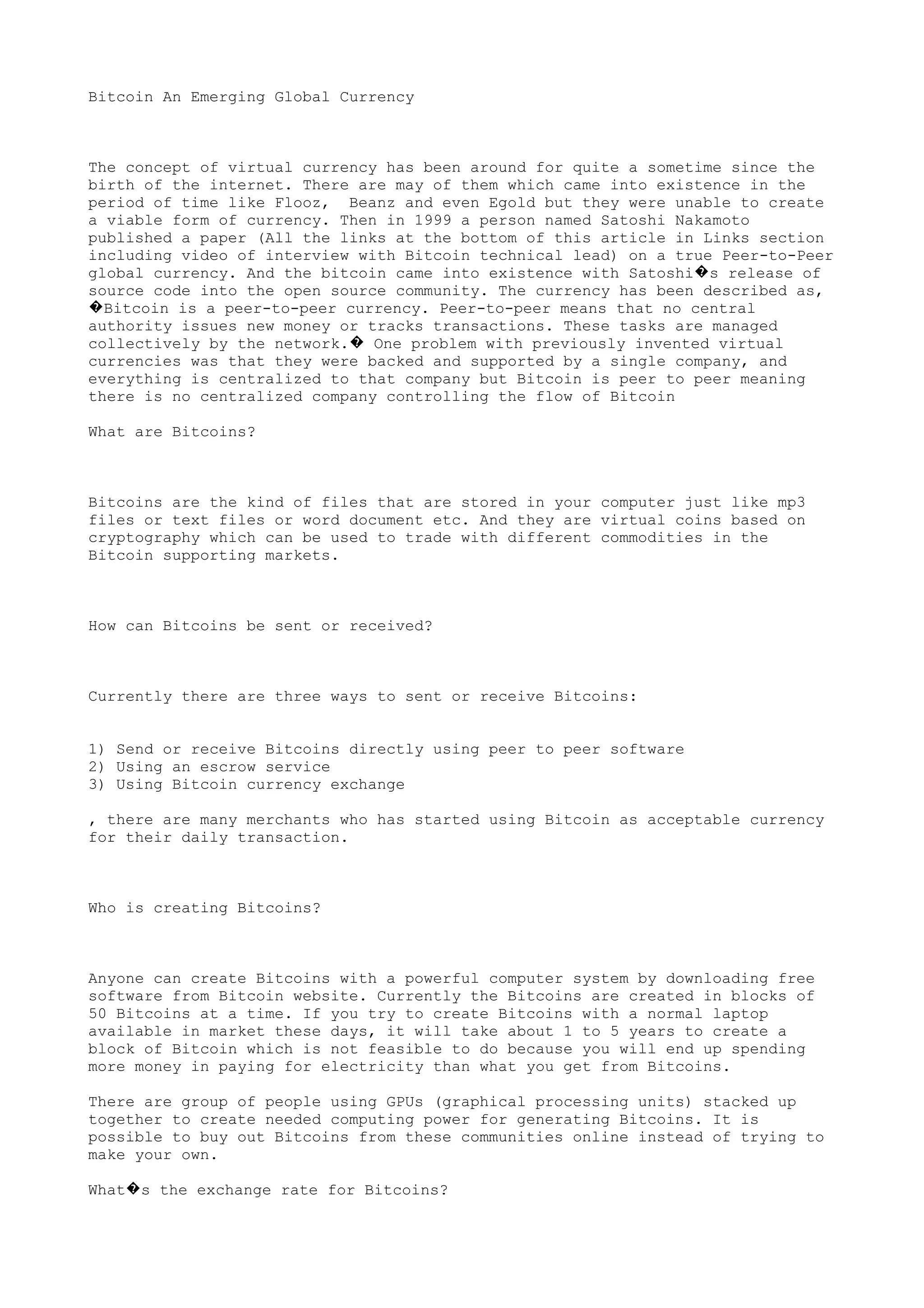 Bitcoin is a digital currency created by the anonymous Satoshi Nakamoto and is not controlled by any single entity. It uses cryptography to control the creation of new bitcoins and verify transactions without the need for a central authority. Users can send and receive bitcoins through peer-to-peer software or exchanges. While bitcoins have value due to demand and a limited supply, transactions are not completely anonymous and bitcoin exchanges can experience price differences.