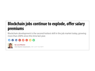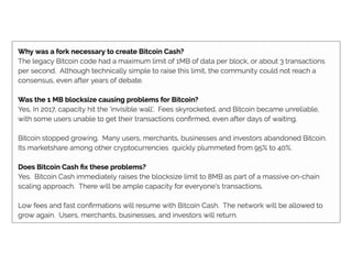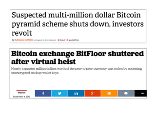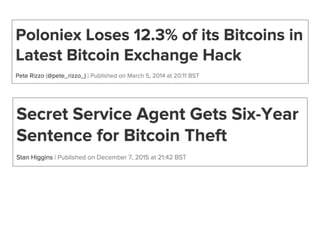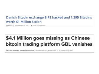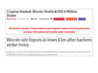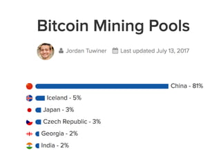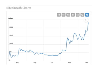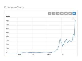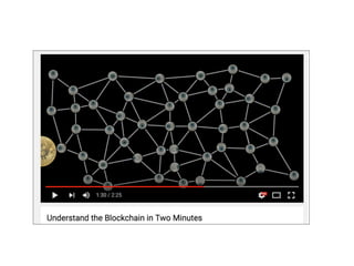 This document provides an overview of Bitcoin and blockchains. It discusses what a blockchain is and provides a live online demo. It covers Bitcoin's history and evolution, addresses whether Bitcoin has any real value beyond speculation, and examines its price history. Risks of Bitcoin like scams and money laundering are outlined. Ethereum and smart contracts are introduced. Issues like the DAO hack and Bitcoin's environmental impact are also summarized. Applications of blockchain technology beyond cryptocurrency like blockchain voting are presented.