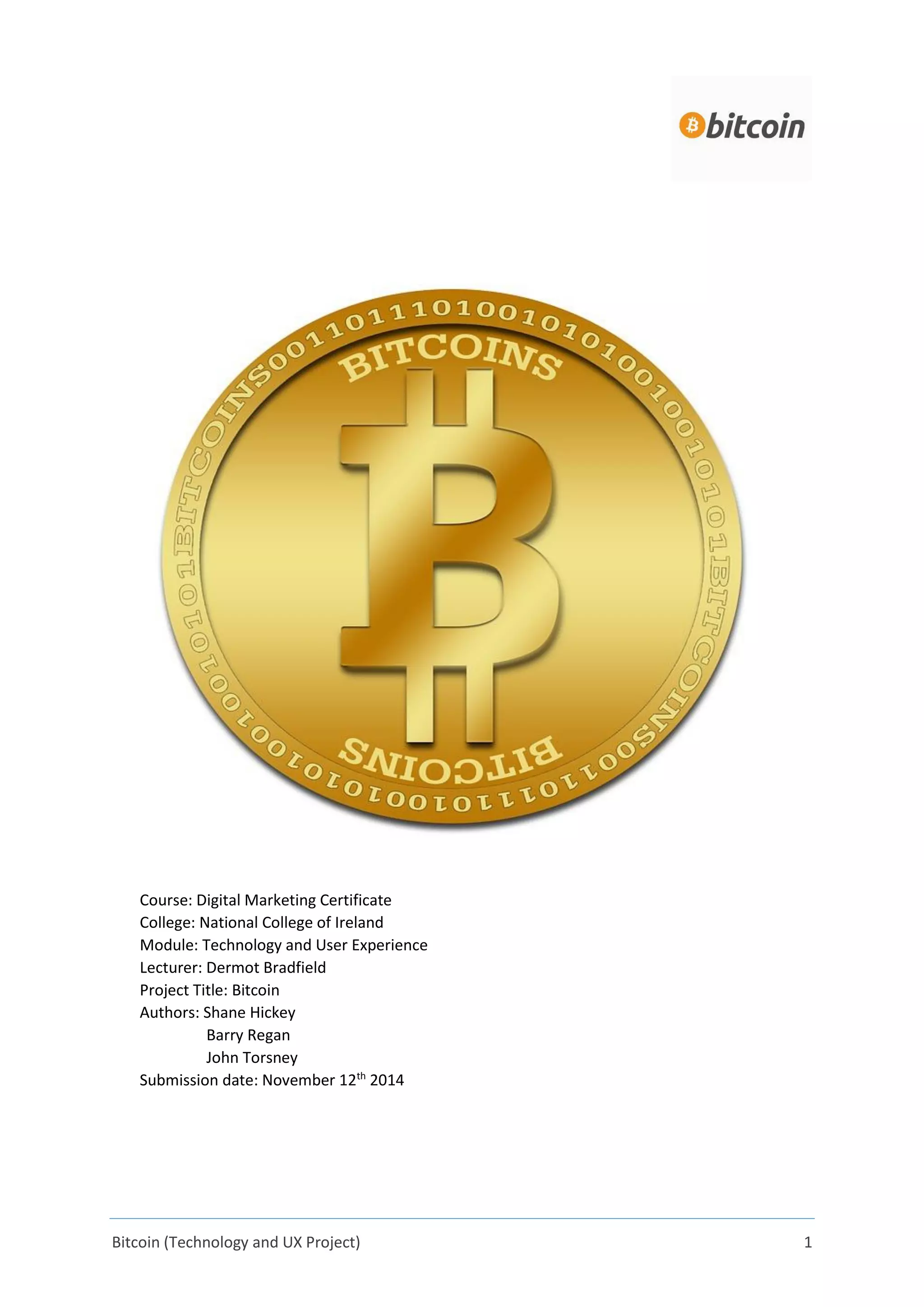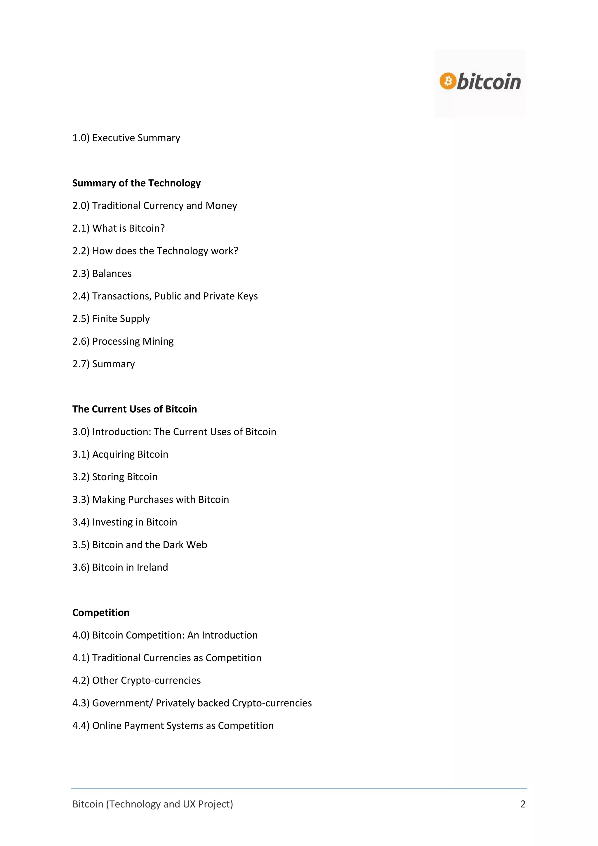 This document provides an overview of a project on Bitcoin that examines the technology behind Bitcoin and its current and potential future uses. It begins with an executive summary of Bitcoin as a decentralized digital currency. It then discusses traditional currency and how Bitcoin compares, explaining how Bitcoin works through balances tracked on the blockchain, transactions facilitated by public and private keys, and mining to process transactions. The document also covers current uses of Bitcoin including acquiring, storing, making purchases with, and investing in Bitcoin. It examines competition from traditional currencies, other cryptocurrencies, and online payment systems. Finally, it discusses potential future developments and applications of Bitcoin technology.