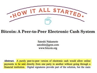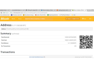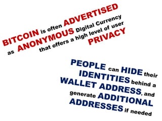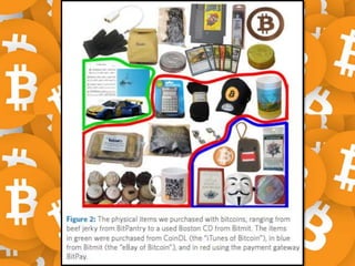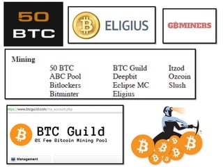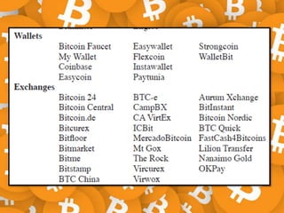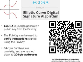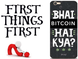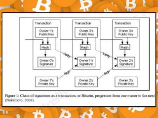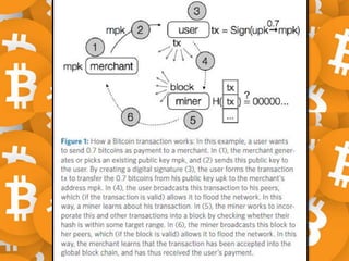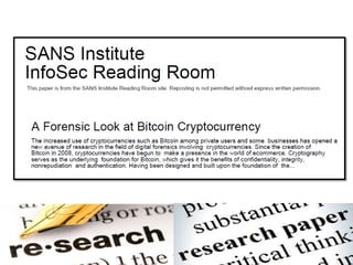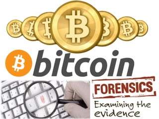 The document discusses Bitcoin and cryptocurrency. It provides an overview of key topics like Bitcoin mining, wallets, blockchain technology, and forensic artifact examination related to Bitcoin. It explains concepts such as public/private keys, blockchain, mining and how transactions are recorded on the distributed ledger to facilitate payments and transfer of ownership of Bitcoin.