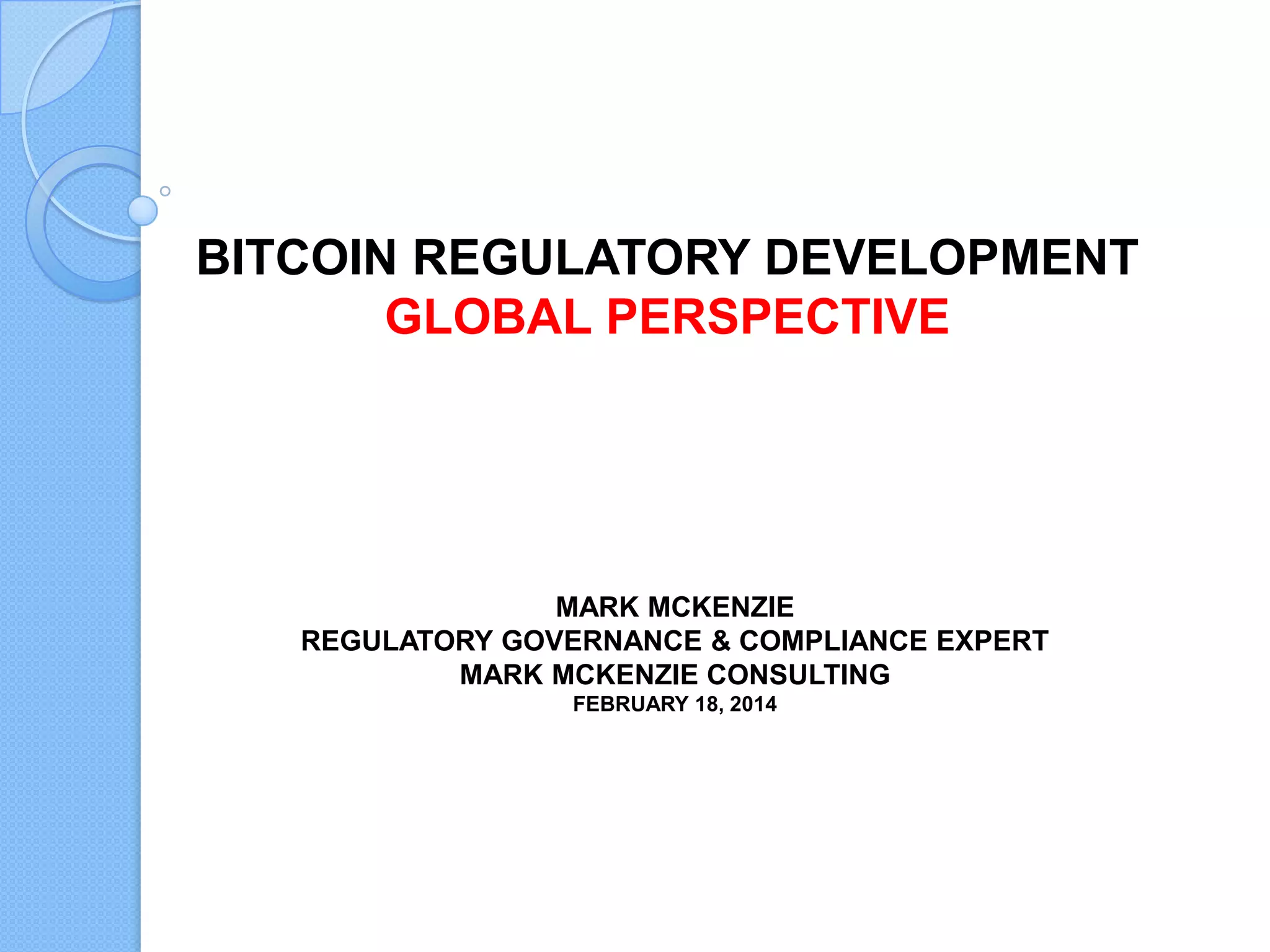 This document summarizes recent global regulatory developments related to bitcoin and virtual currencies. It discusses regulatory actions and perspectives from the US, Canada, Russia, India, and China. In the US, New York plans to issue a "BitLicense" for virtual currency businesses. Canada has taken a generally hands-off approach but its anti-money laundering agency FINTRAC is now considering regulations. Russia and India have issued warnings about virtual currencies while China has banned their use by banks and merchants. Overall regulatory approaches to bitcoin are still developing worldwide as these new technologies emerge.