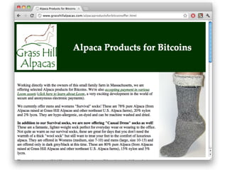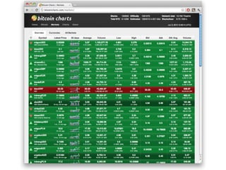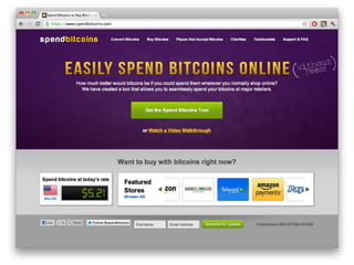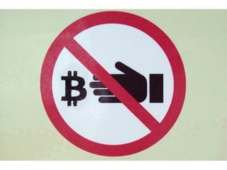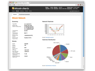 This document discusses Bitcoin, a digital currency that uses peer-to-peer technology and public key cryptography to operate without a central authority. It provides information on what Bitcoin is, how it works through an open source software, its adoption rate, usage examples, underlying technology including public key crypto and blockchain, available software, and future considerations around adoption, security and scalability. The document shares Bitcoin addresses, links, images and tweets to illustrate key points about Bitcoin.