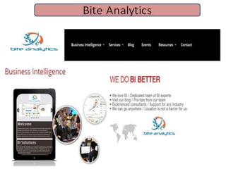 Bite Analytics provides business intelligence and analytics consulting services using Tableau, including dashboard design, Tableau Server implementation and tuning, and health checks of existing BI solutions. They have expertise across multiple industries including healthcare, oil and gas, automotive, retail, and market research. Bite Analytics also offers web design, development, API integration, and digital marketing services to help clients succeed online.