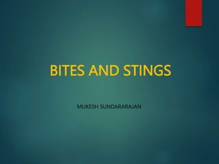 This document provides guidance on first aid for animal bites, insect stings, and snake bites. It advises remaining calm, cleaning and dressing wounds, immobilizing affected areas as needed, and seeking medical help for serious injuries or allergic reactions. Precautions are described such as giving animals space, not provoking them, and calling for assistance if a situation cannot be handled alone.