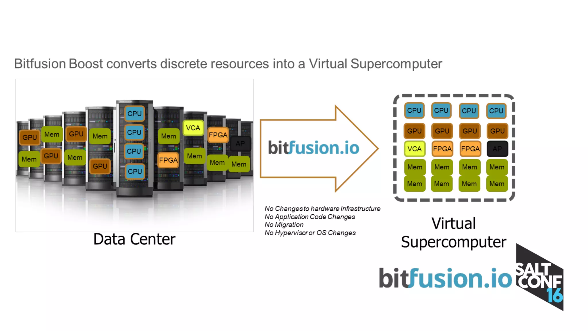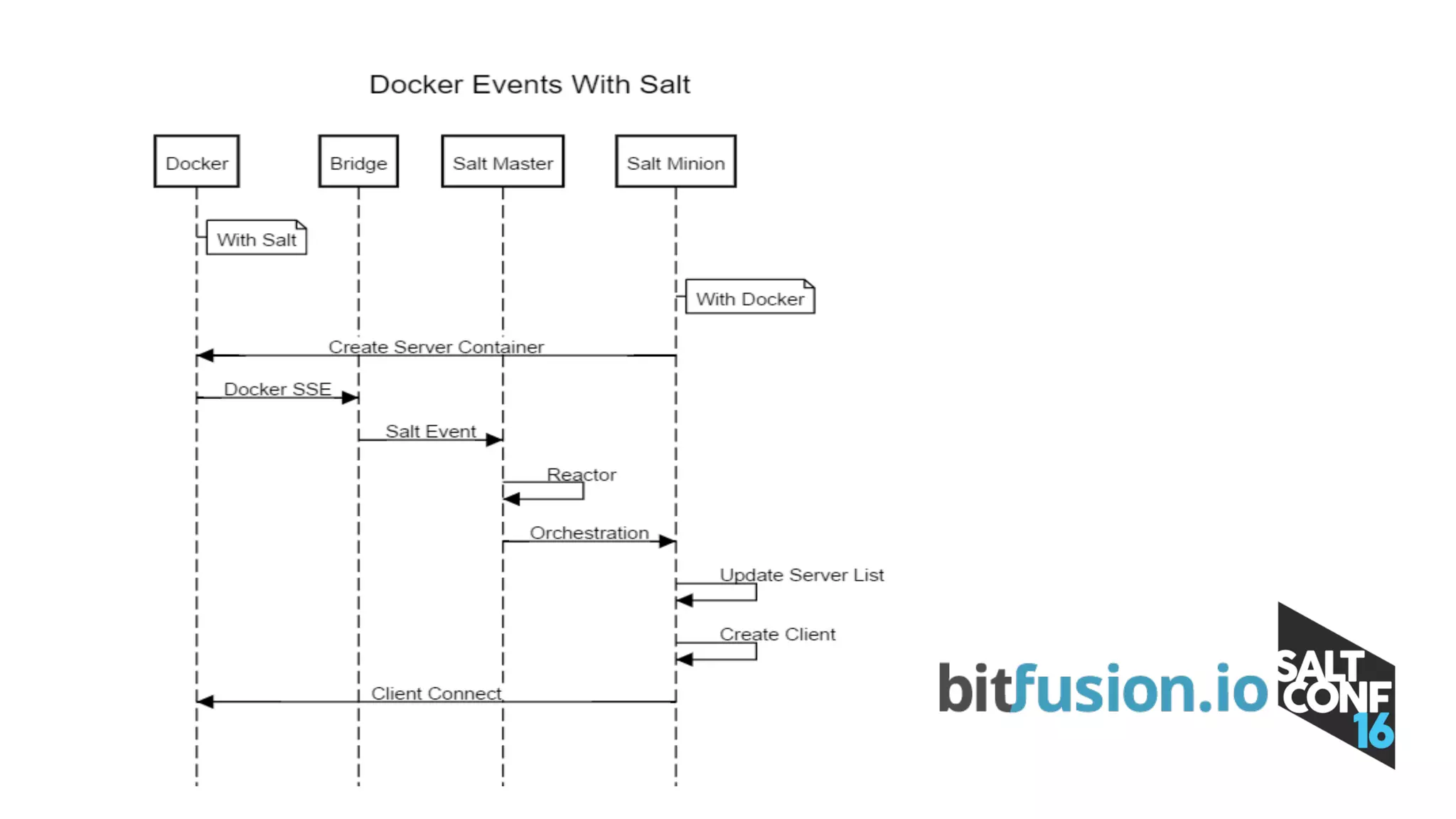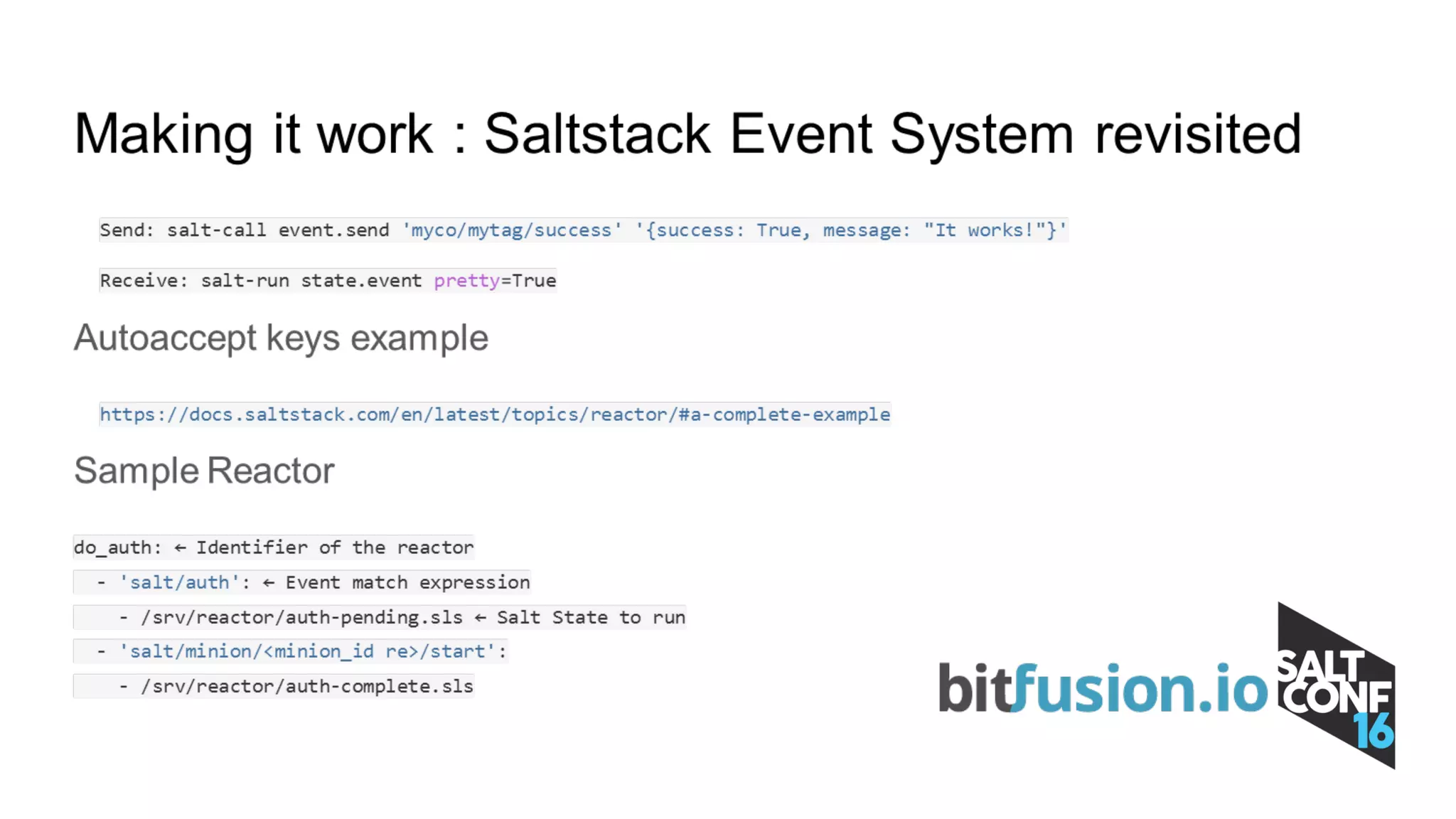 This document discusses using SaltStack for seamless orchestration of virtual machines and Docker containers. It provides an overview of Bitfusion and SaltStack, and how SaltStack's event reactor system can be used to publish Docker events to the SaltStack event bus and react to those events with Salt states. This allows for autoconfiguration of environments and other capabilities. The presentation includes demos of enabling GPU-accelerated Docker containers with Bitfusion and SaltStack. It concludes by requesting feedback via the SaltConf16 event app.
