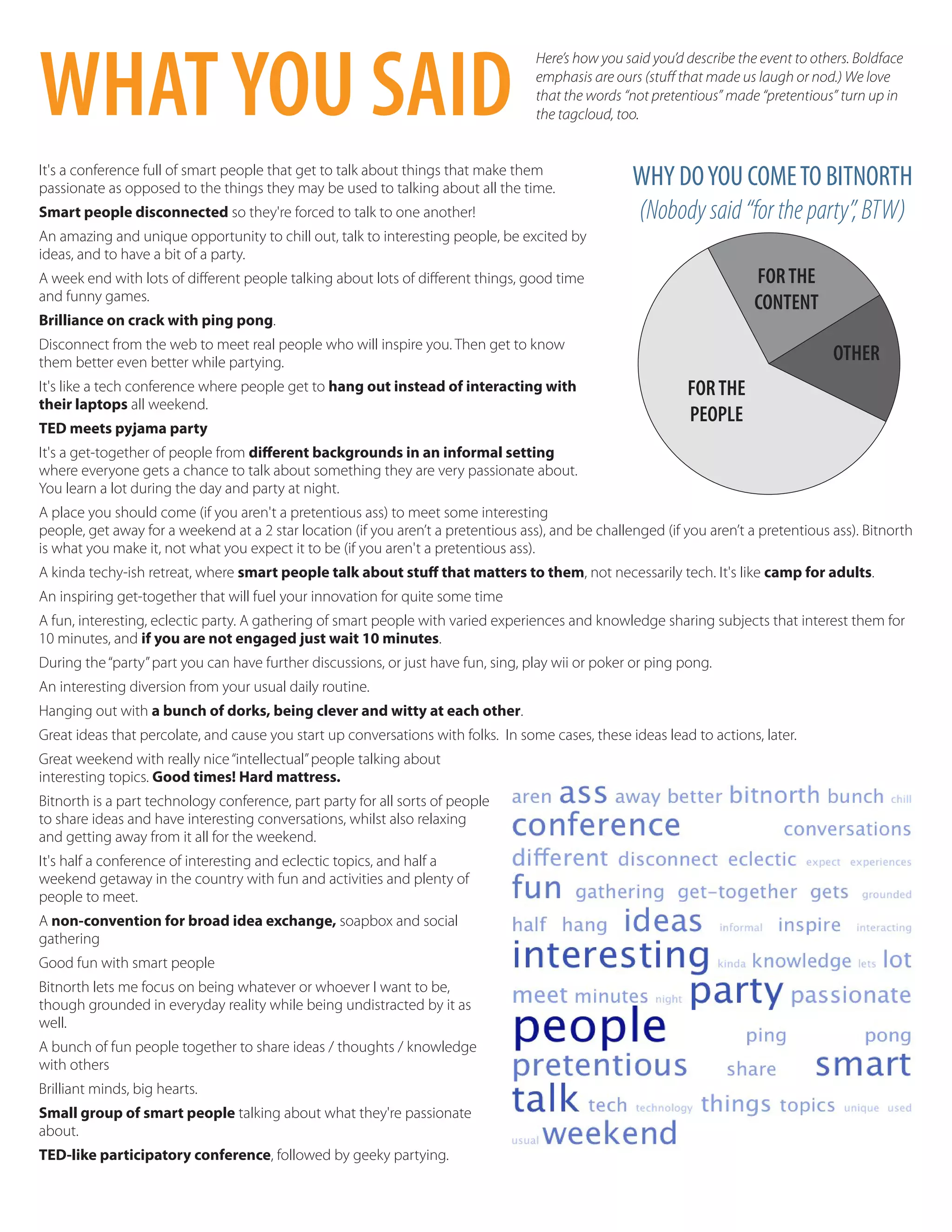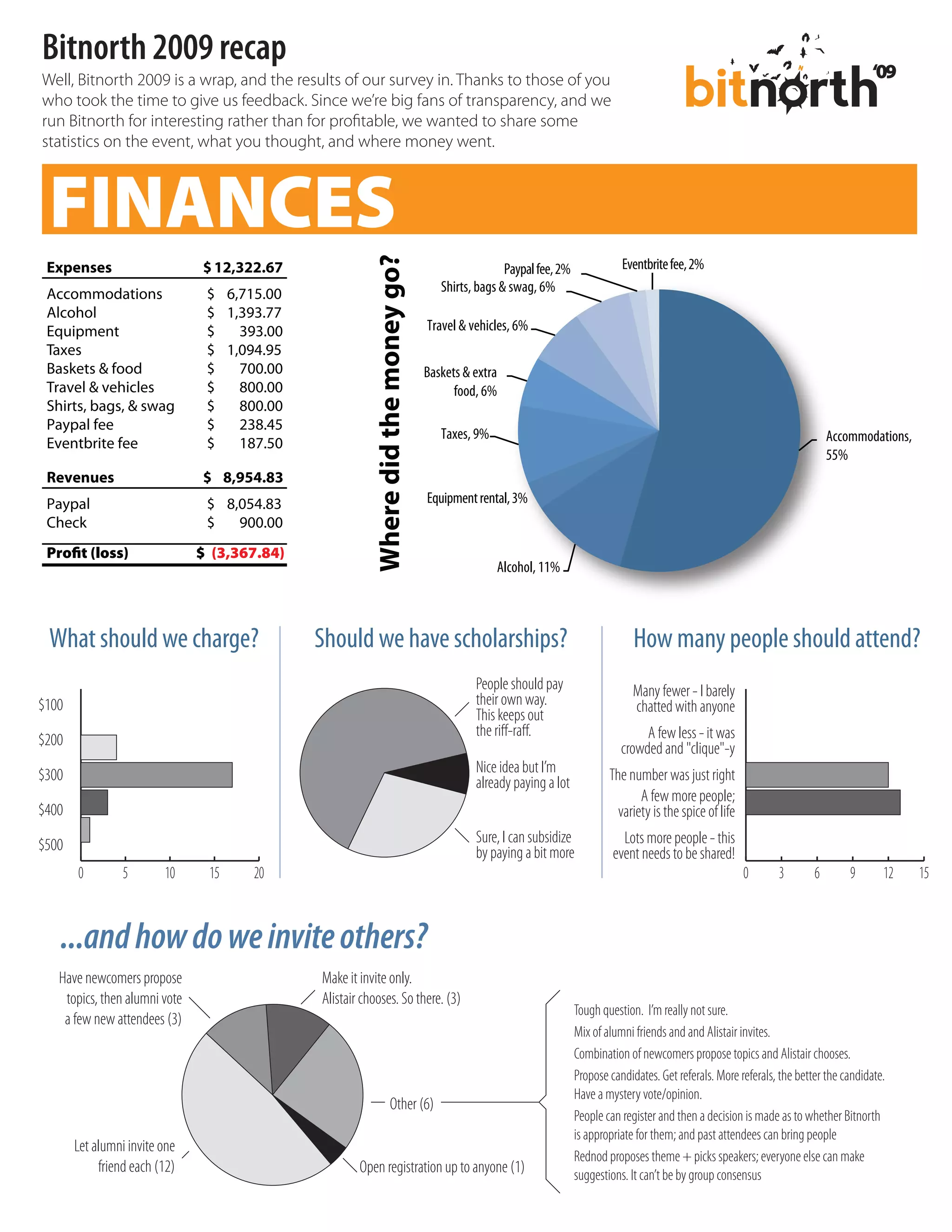 Bitnorth 2009 was held and the organizers shared the financial results and participant feedback from the event. The event had a loss of $3,367.84 with the largest expenses being accommodations ($6,715) and alcohol ($1,393.77). A survey of participants showed that the most popular ways to invite others would be to let past attendees invite one friend each or have newcomers propose topics for discussion. Participants said they attended for the content of discussions and the interesting people they could meet.