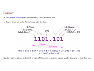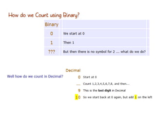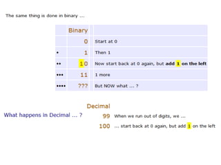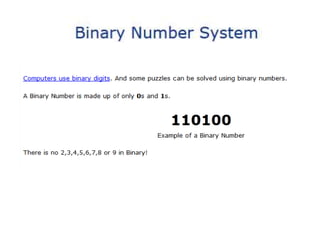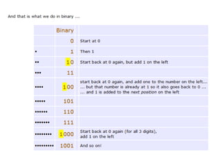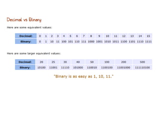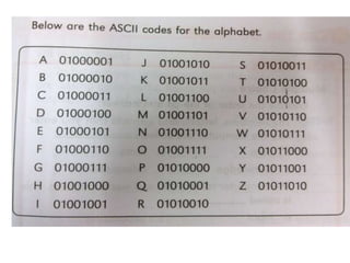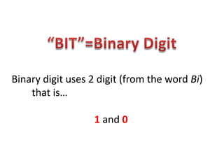This document discusses binary digits and bytes. It explains that binary uses 1s and 0s and each character represents 8 bits or 1 byte. It then provides examples of common words and their bit sizes when represented in binary. For several words, it lists the binary code representations.