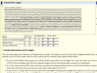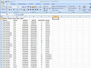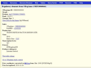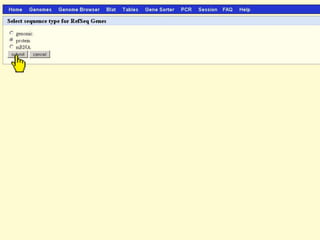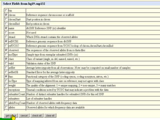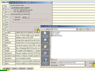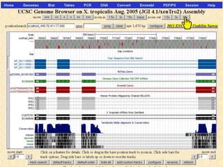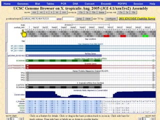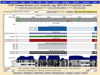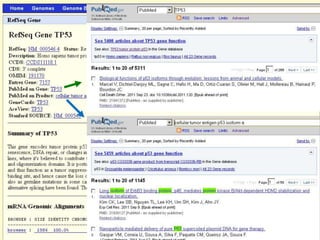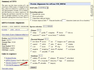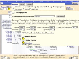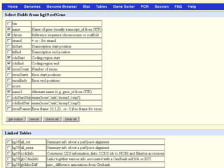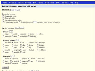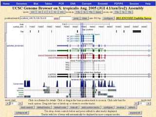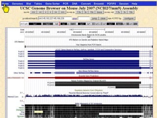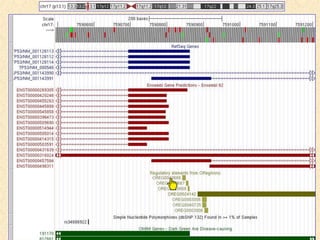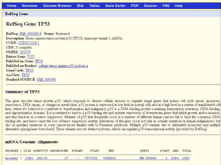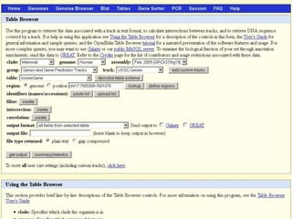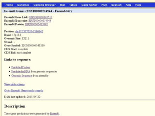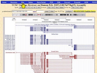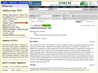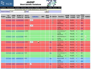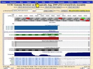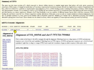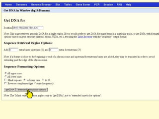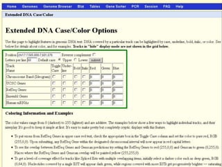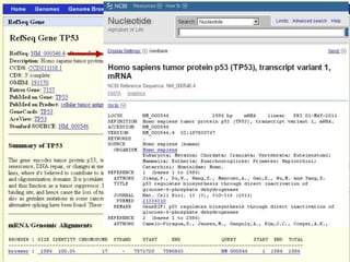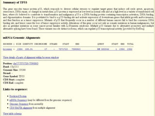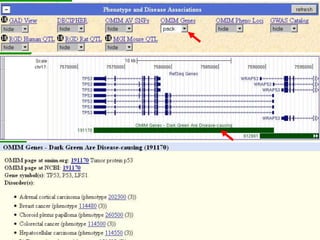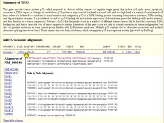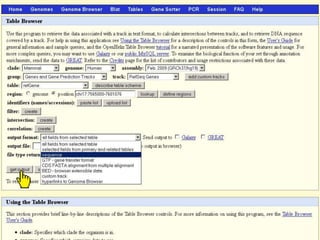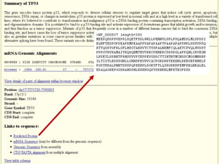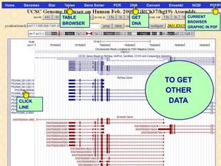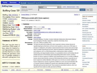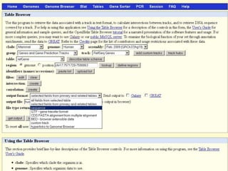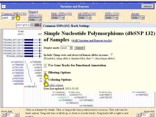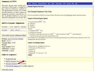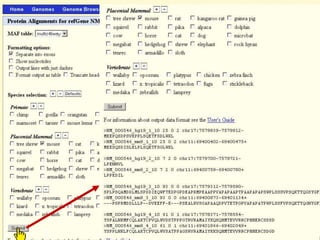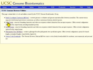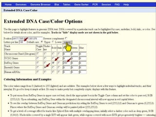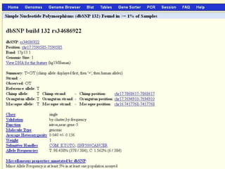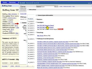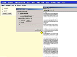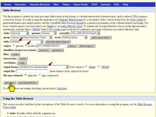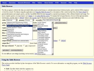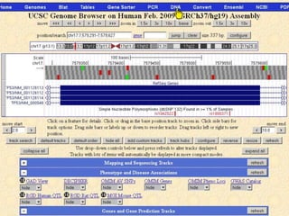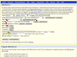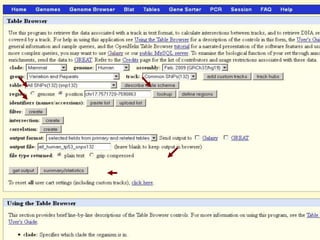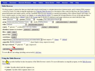 The document describes various resources and tools available for genomic research, including GenBank, RefSeq, and Ensembl for gene annotation. It includes exercises for retrieving gene sequences, analyzing SNPs, and using alignment tools like BLAT to find orthologs. Additionally, it provides guidelines for saving results in different formats for further analysis.