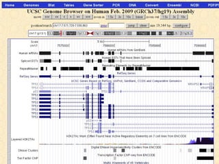 The document provides an overview of the UCSC Genome Browser, detailing its features for browsing genes, searching genomic information, and viewing genome organization. It highlights collaborations with other genome browsers such as Ensembl and NCBI, and introduces tools available for genomic analysis, including BLAT, in-silico PCR, and various visualization options. Additionally, it outlines navigation methods and exercises for users to explore specific genes and their associated data.