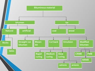 The document provides information on different types of bitumen and bitumen modification. It discusses natural bitumen, artificial bitumen including straight run bitumen and blown bitumen. It also describes cut back bitumen, emulsions, and modified bitumens including crumb rubber modified bitumen, natural rubber modified bitumen, and polymer modified bitumen. The document lists the advantages of modified bitumens and guidelines for their use. It provides details on consistency tests, performance tests, and grades of different modified bitumens.