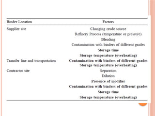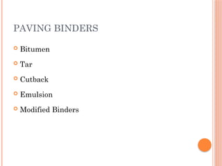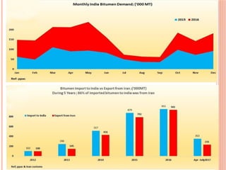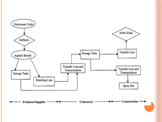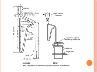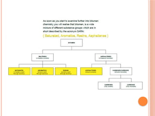 The document discusses bituminous materials, focusing on the origins and properties of bitumen and tar, including their chemical characteristics and production processes. It outlines various applications of bitumen in construction and highlights the growing global market, particularly in India. Key differences between bitumen and tar are presented, along with information on the manufacturing processes and the significance of bitumen properties in their performance.