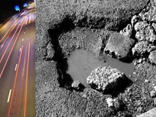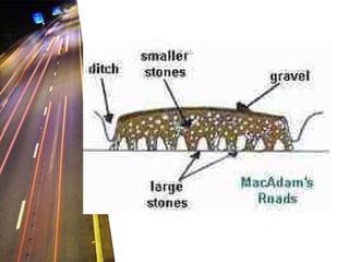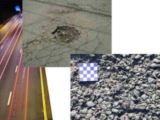 The document discusses different types of bituminous pavement used in highway engineering. It describes how bituminous pavement is made by mixing heated aggregates like crushed stone with heated asphalt binders. It then lists various types of bituminous pavement like asphalt concrete and discusses their properties and appropriate uses based on traffic levels. The document also discusses factors that can lead to failures of bituminous concrete pavement like excessive loads beyond the pavement's strength.