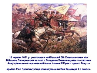18 червня 1651р. розпочався найбільший бій Хмельниччини між18 червня 1651 р. розпочався найбільший бій Хмельниччини між