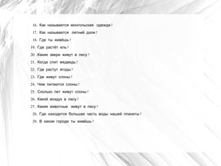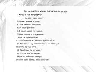 Документ содержит список вопросов для экзамена по русскому языку для учащихся 9-го класса. Вопросы охватывают различные темы, включая личные данные, родную страну, семью, любимые занятия и природу. Целью вопросов является оценка знаний и умений студентов в устной практике русского языка.