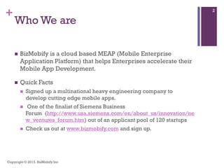 BizMobify is a cloud-based mobile enterprise application platform (MEAP) that helps companies accelerate their mobile app development and evolve from eBusiness to mBusiness. It allows non-technical users to easily create mobile apps through a drag-and-drop interface and integrates existing backend systems. BizMobify plans to partner with enterprises, consulting firms, API management companies and others to quickly grow its customer base.