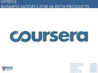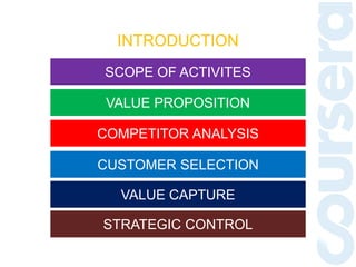 This document provides an overview of Coursera's business model for offering massive open online courses (MOOCs). It discusses Coursera's value proposition including offering prestigious courses from elite universities, verified certificates, recognition of credits, and career advancement services. Competitor analysis shows Coursera has the most students and courses compared to other MOOC providers. Coursera's customer selection targets individuals seeking new learning opportunities and career advancement as well as companies interested in corporate training. Coursera captures value through premium services, licensing, career services, merchandise, and affiliate programs. Strategic controls include establishing exclusive university partnerships, securing assessments, and exploring new revenue streams like corporate learning and a low-cost learning tablet.