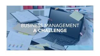 The document discusses the challenges of business management and information overload. It introduces a business management platform called BizNext that provides real-time visibility into all business functions through seamless integration of information and processes. BizNext offers modules for sales, operations, purchasing, inventory, and workflow management. It provides business analytics, is responsive to changing business needs, and allows access from anywhere on any device.