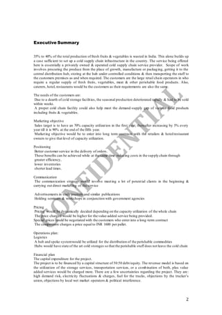 The document discusses setting up a privately owned cold supply chain service provider in India. 35-40% of fresh fruits and vegetables are wasted due to a lack of cold storage infrastructure. The proposed business will procure, store, and transport perishable foods like fruits, vegetables, meat and food products from producers to retailers and restaurants on a regular basis using refrigerated trucks and centralized distribution hubs with cold storage facilities. The goal is to utilize 70% of capacity in the first year, increasing to 90% by the fifth year through long term contracts with customers.