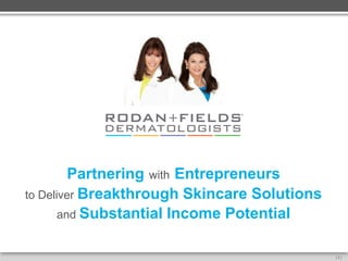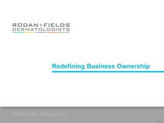 This document discusses redefining business ownership through a direct sales model partnering with entrepreneurs to deliver skincare solutions. It notes that traditional business models are changing as power shifts from corporations to individuals in the new social economy. The direct sales model presented provides clinically proven skincare products, a well-established brand, low startup costs, and high profit potential by leveraging social networks. It highlights the financial opportunities and support systems available to those participating in the direct sales program.