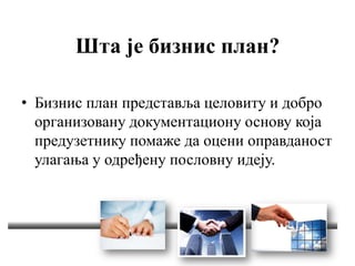 • Бизнис план представља целовиту и добро