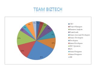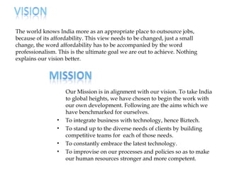The document outlines BizTech's vision of transforming India from a low-cost outsourcing destination to a hub of professionalism and quality in technology services. Founded in 2007, BizTech has maintained consistent growth and financial stability while prioritizing client satisfaction through skilled teams, strict quality standards, and innovative solutions. The company aims to combine technology, people, and quality to meet diverse client needs and achieve successful project outcomes.