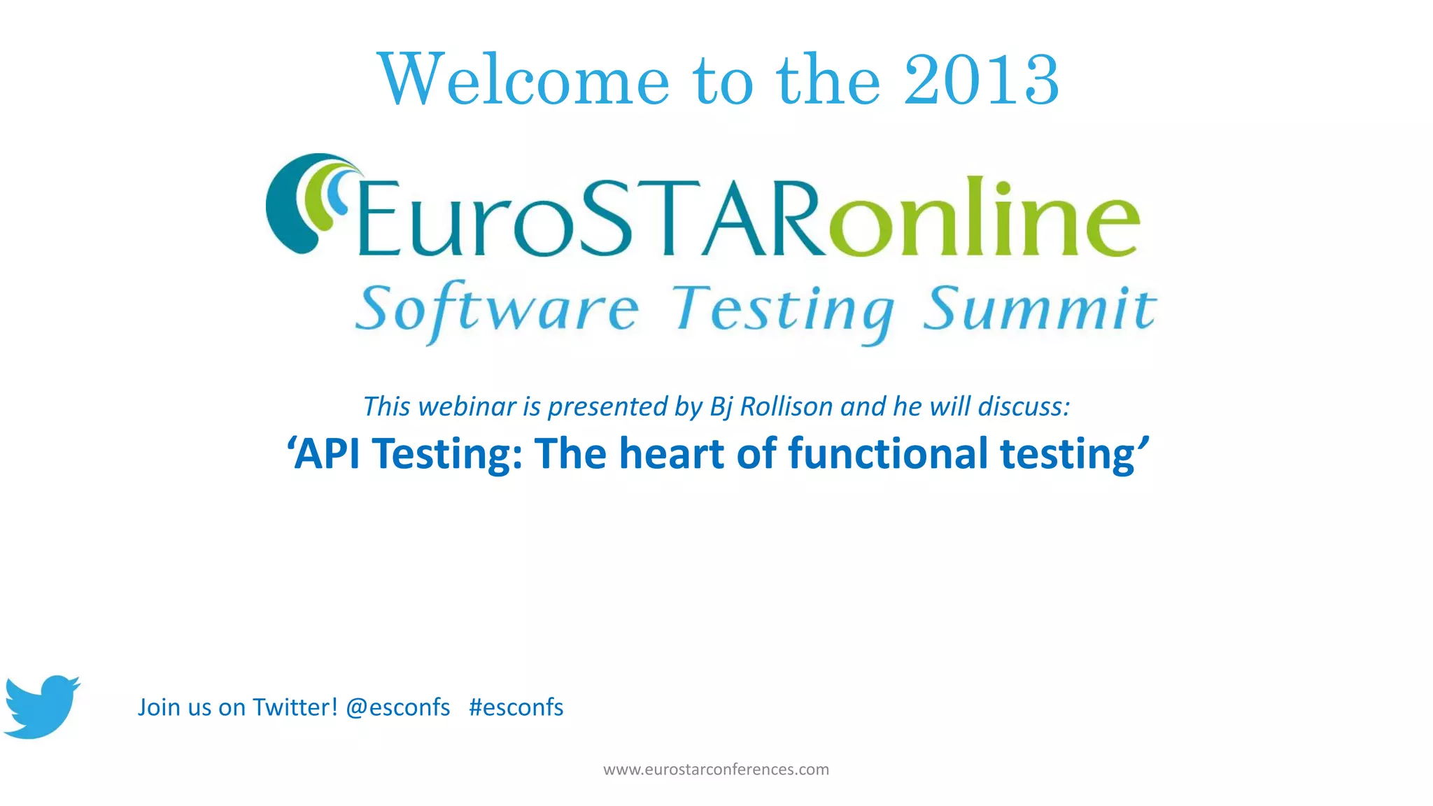 This webinar, presented by BJ Rollison, discusses API testing as a critical component of functional testing, highlighting its significance in agile development and its differences from unit testing. API testing focuses on functionality below the user interface, aims to identify a variety of bugs, and employs both black box and white box testing approaches. Key advantages of API testing include cost reduction, improved automation stability, and the ability to detect a wider range of issues early in the development process.