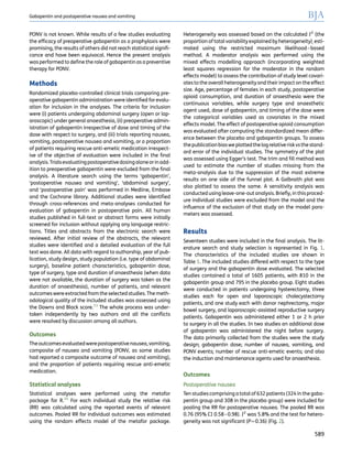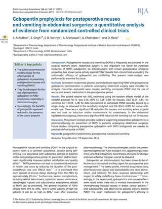 The study analyzes the effectiveness of preoperative gabapentin in preventing postoperative nausea and vomiting (PONV) in abdominal surgeries, finding supportive evidence for its use, with a pooled relative risk reduction for nausea and vomiting. The analysis involved 17 randomized controlled trials, demonstrating a significant decrease in PONV, particularly when propofol was not used in anaesthesia. Future research is suggested to compare gabapentin's efficacy against traditional anti-emetic therapies like 5-HT3 antagonists.