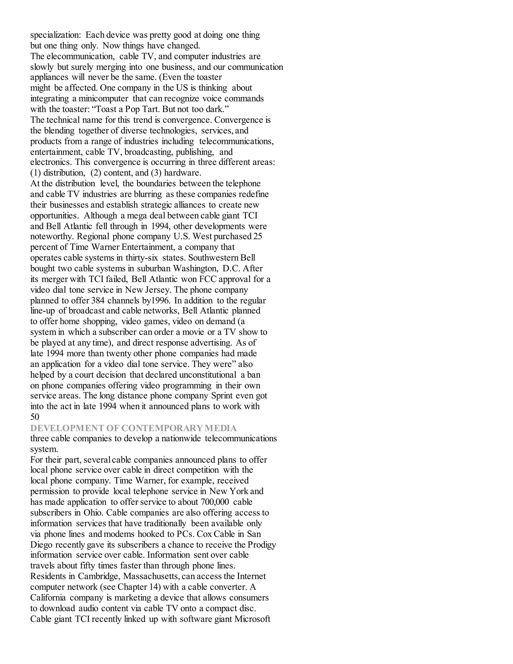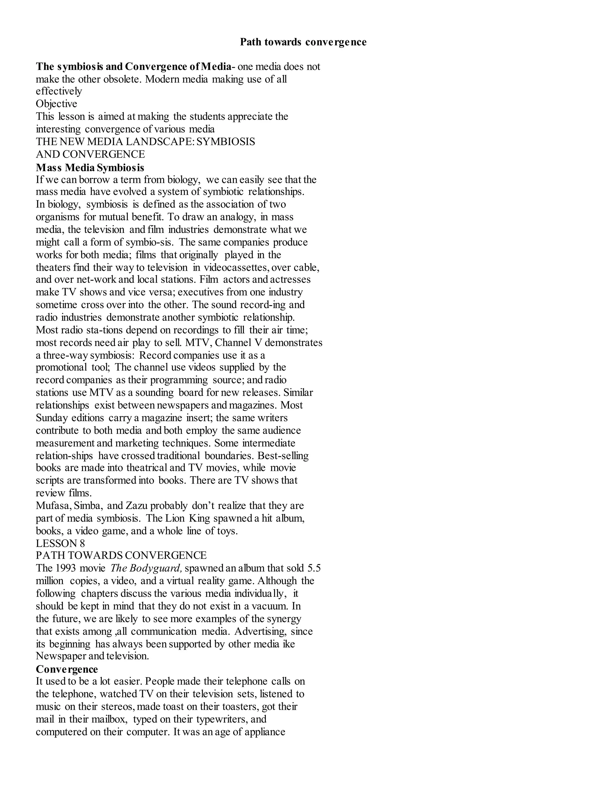The document discusses the symbiotic relationships and convergence among various media industries, highlighting how mass media sectors like television, film, and radio collaborate for mutual benefit. It emphasizes the ongoing merger of telecommunications, entertainment, and electronics into a cohesive structure, where devices once specialized for single purposes are evolving into multifunctional systems. Moreover, it predicts that content providers will increasingly blur the lines between traditional media categories, leading to the emergence of integrated technologies like the 'compu-tv'.