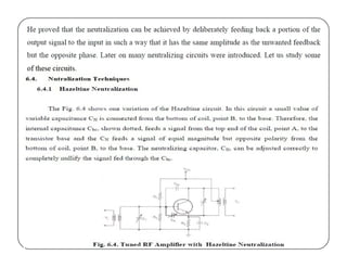 Tuned amplifiers are used to amplify narrowband signals at a specific frequency. They use a tuned or resonant circuit, such as a parallel LC circuit, as the collector load. This tuned circuit provides high impedance and maximum gain at the resonant frequency. Tuned amplifiers include single tuned, double tuned, and staggered tuned configurations depending on the number of tuned circuits used. The Q factor and bandwidth of the tuned circuit determine the selectivity of the amplifier. Tuned amplifiers are used in radio transmitters and receivers due to their ability to selectively amplify signals within a narrow bandwidth.